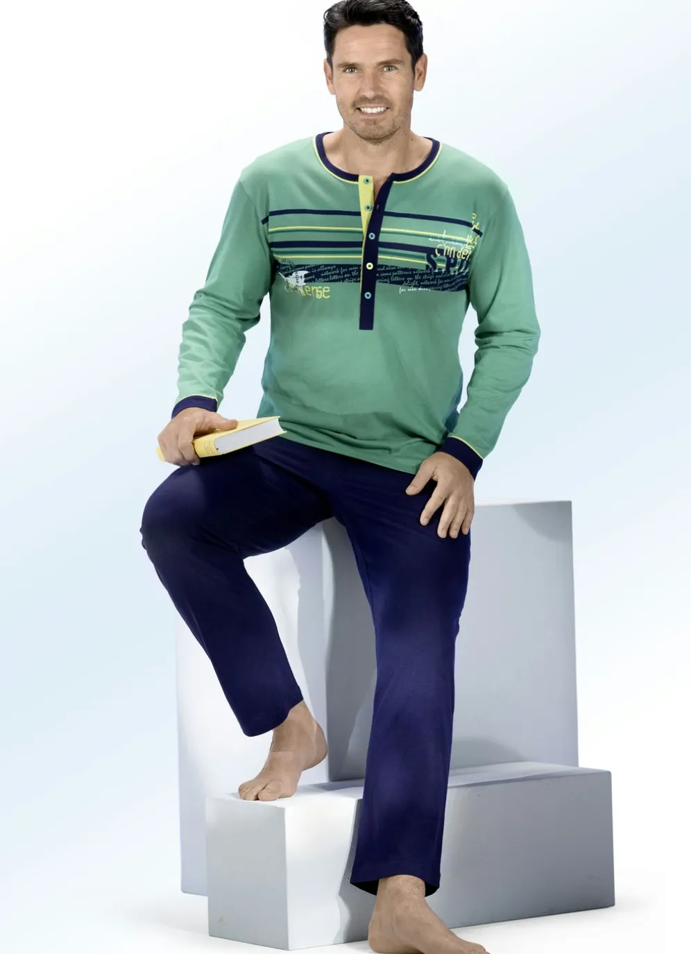 Schlafanzug mit langer Knopfleiste, Streifendessin und platziertem Druckmotiv in Grün-Marine und in Größe 58.