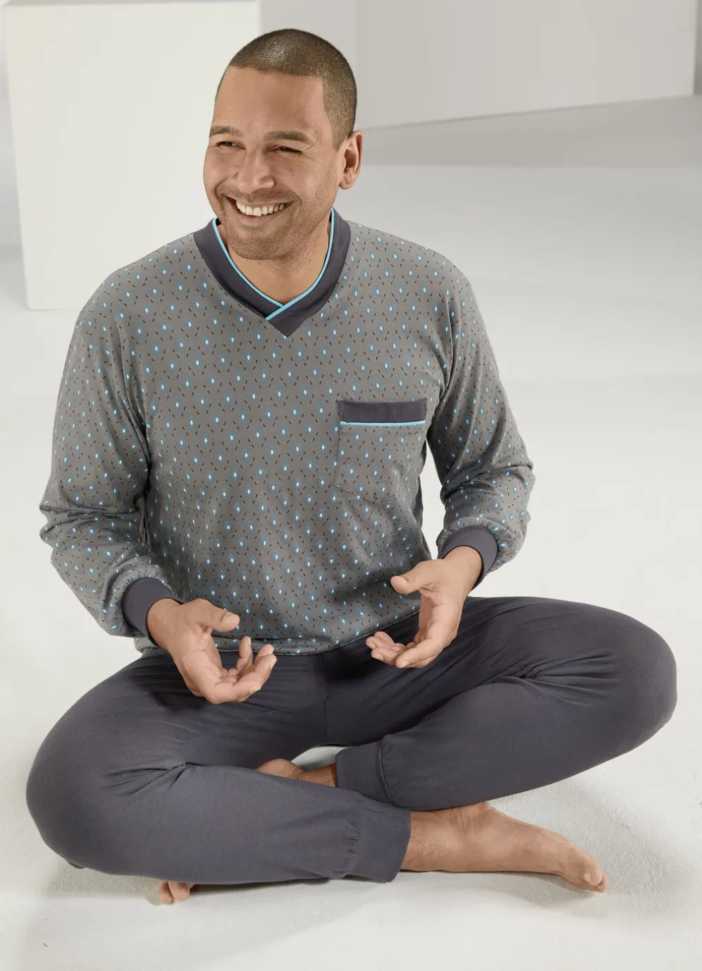 Schlafanzug mit V-Ausschnitt, Brusttasche sowie Ärmel- und Beinbündchen in Grau-Türkis und in Größe 46.