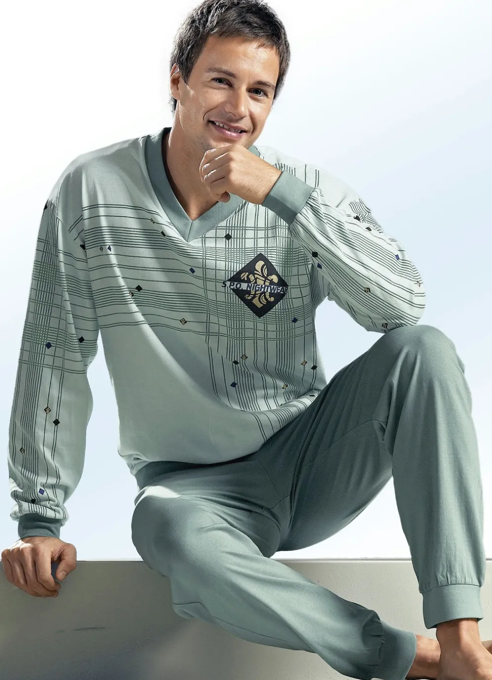 Attraktiver Schlafanzug in Hellgrün-Zeder-Bunt: Das Oberteil ist vorne dessiniert und mit V-Ausschnitt sowie platziertem Druckmotiv gearbeitet. Lange Hose mit auswechselbarem Gummizug im Bund. Die Bündchenabschlüsse sorgen für perfekten Sitz.