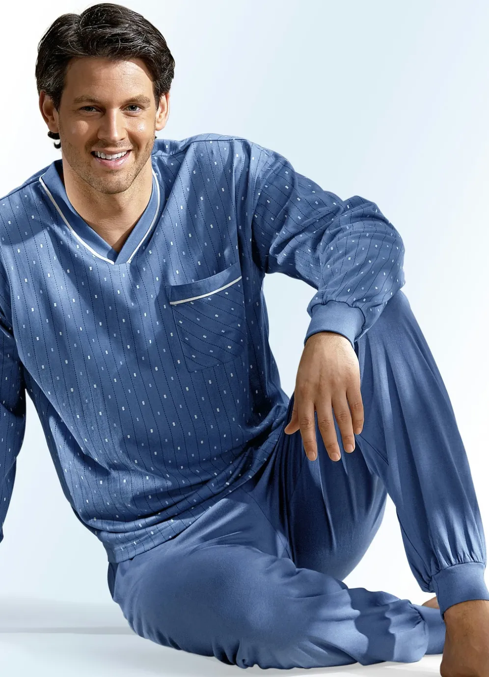 Schlafanzug mit V-Ausschnitt und Bündchen in Indigoblau und in Größe 48.