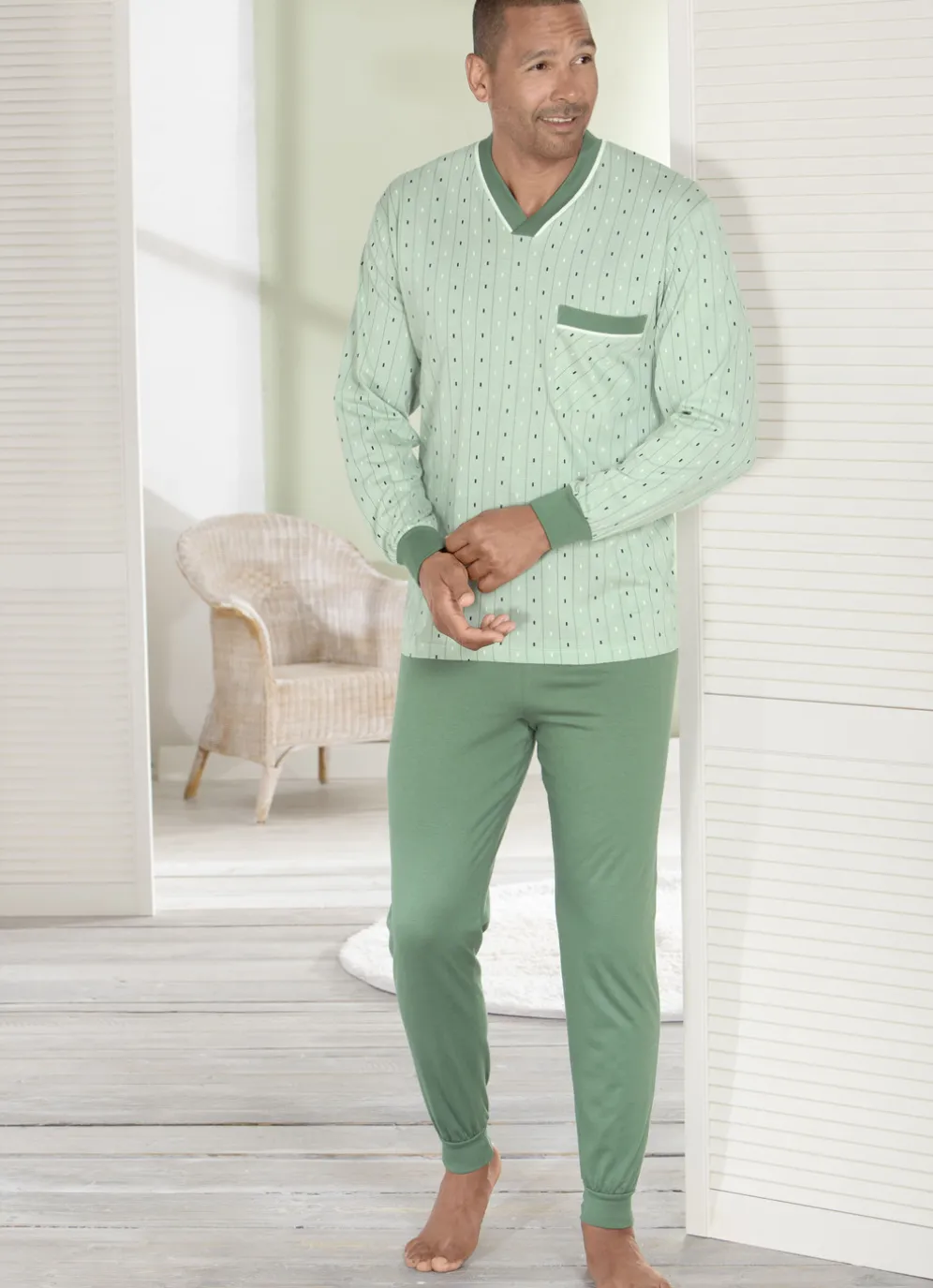 Erholen Sie sich gut in diesem angenehm zu tragenden Schlafanzug: Das Oberteil ist mit Ärmelbündchen gearbeitet. Es präsentiert ein Alloverdessin, überschnittenen V-Ausschnitt, aufgesetzte Brusttasche sowie Kontrastpaspeln. Lange Hose mit auswechselbarem Gummizug im Bund sowie Bündchenabschlüssen.