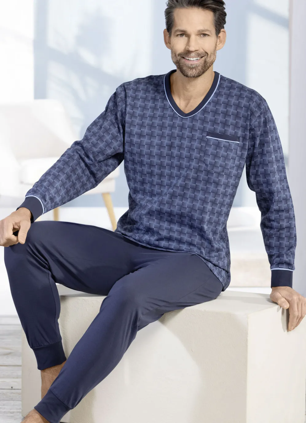Marinefarbener Schlafanzug mit Bündchenabschlüssen! Allover dessiniertes Oberteil mit hellblauen Akzenten, V-Ausschnitt sowie aufgesetzter Brusttasche. Lange Hose mit Dehnbund.