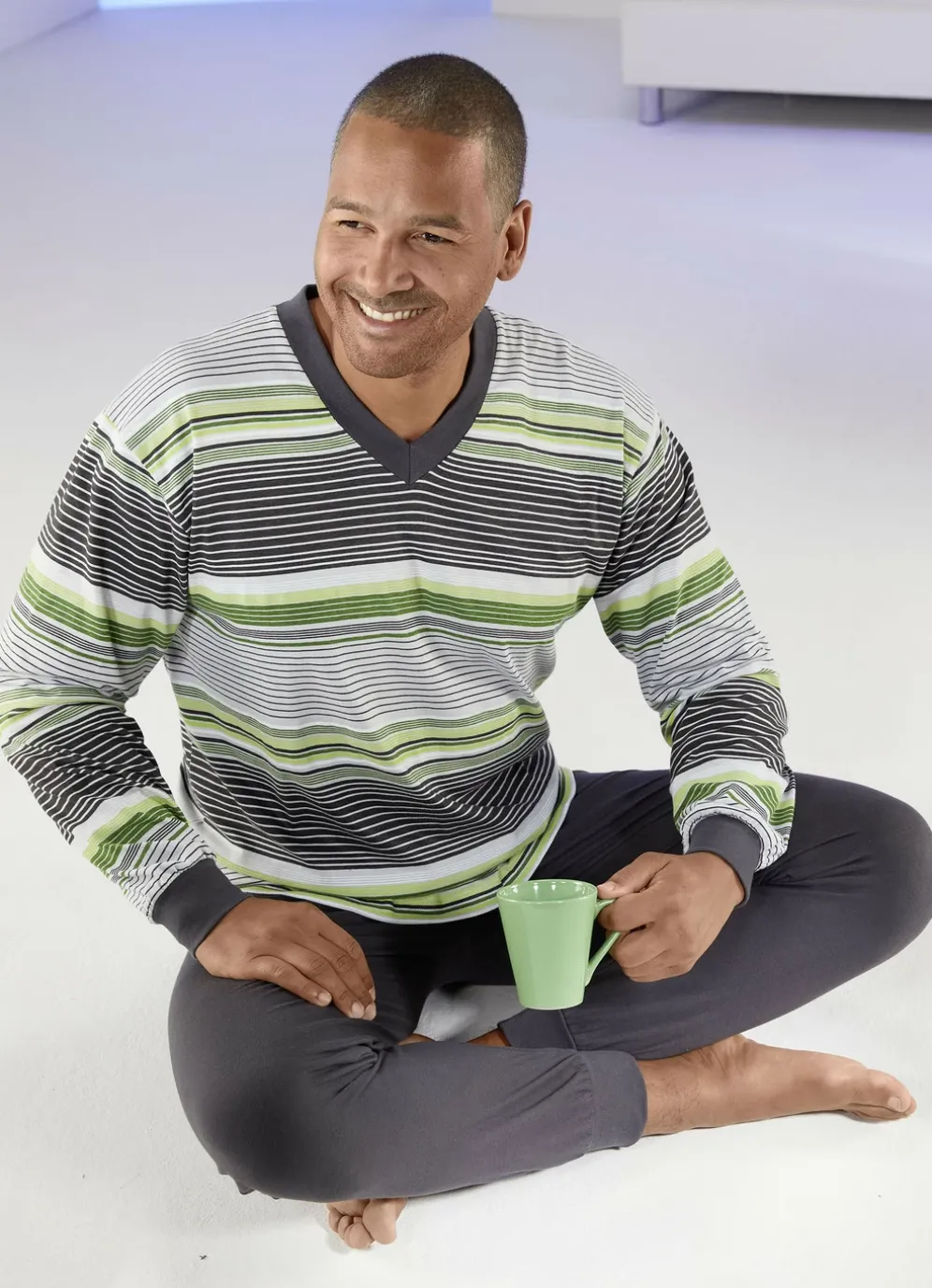 Attraktiver Schlafanzug: Oberteil mit Ringeldessin in Grau-Grün, V-Ausschnitt und Ärmelbündchen. Lange, graue Hose mit auswechselbarem Gummizug im Bund sowie Bündchenabschlüssen.