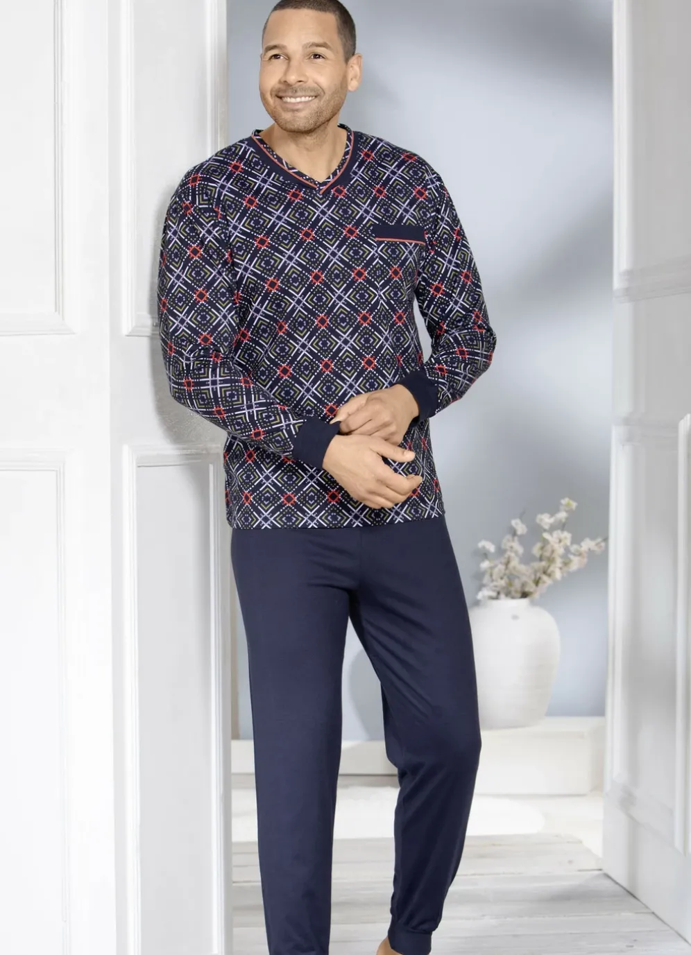 Raffinierter Schlafanzug in Marine-Orange-Bunt! Allover dessiniertes Oberteil mit V-Ausschnitt, aufgesetzter Brusttasche, Bündchenabschlüssen sowie innererem Rückensattel. Lange, marinefarbene Hose mit Dehnbund und Bündchenabschlüssen.