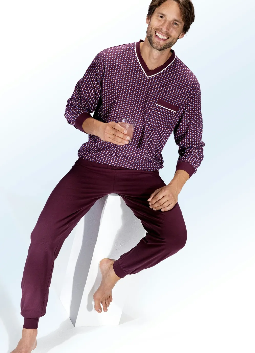 Schlafanzug mit V-Ausschnitt und Bündchenabschlüssen in Kastanie-Bunt und in Größe 48.