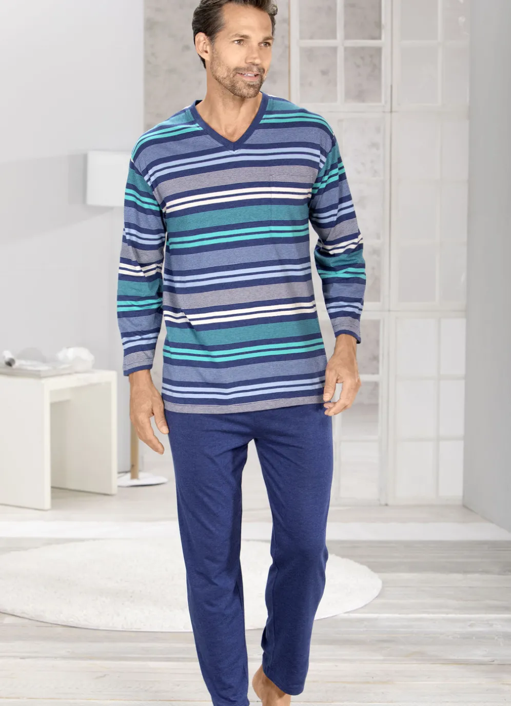 Markanter Schlafanzug in Blau-Grün-Bunt mit offenen Abschlüssen. Oberteil mit garngefärbtem Ringeldessin, V-Ausschnitt, aufgesetzter Brusttasche sowie innerem Rückensattel. Jeansblau melierte Hose mit Dehnbund und Seitentaschen.