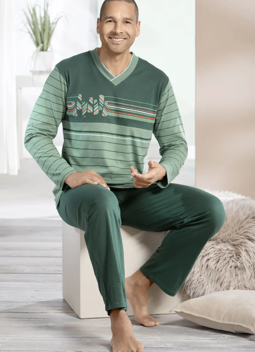 Schlafanzug mit offenen Abschlüssen: Oberteil in Grün-Bunt, mit V-Ausschnitt und platziertem Druck vorne. Lange Hose mit auswechselbarem Gummizug im Bund.