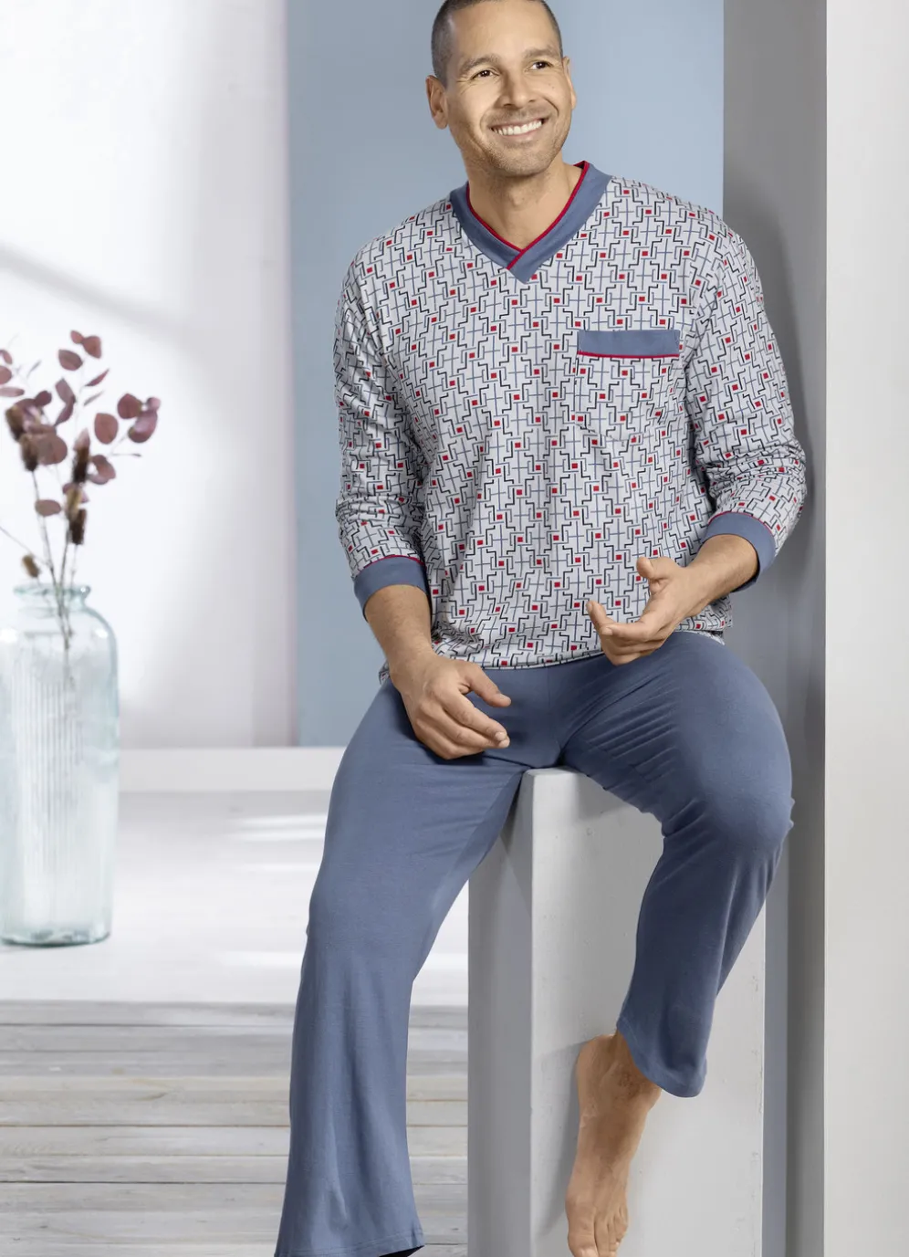 Stilsicherer Schlafanzug mit offenen Abschlüssen in Hellgrau-Rauchblau-Bunt: Allover dessiniertes Oberteil mit Kontrastpaspeln an V-Ausschnitt, Ärmeln sowie aufgesetzter Brusttasche. Lange Hose mit auswechselbarem Gummizug im Bund.
