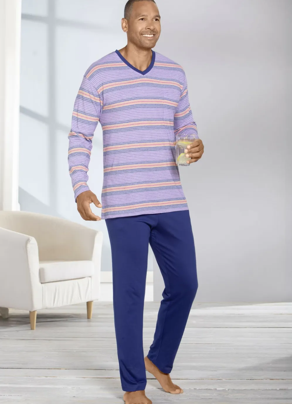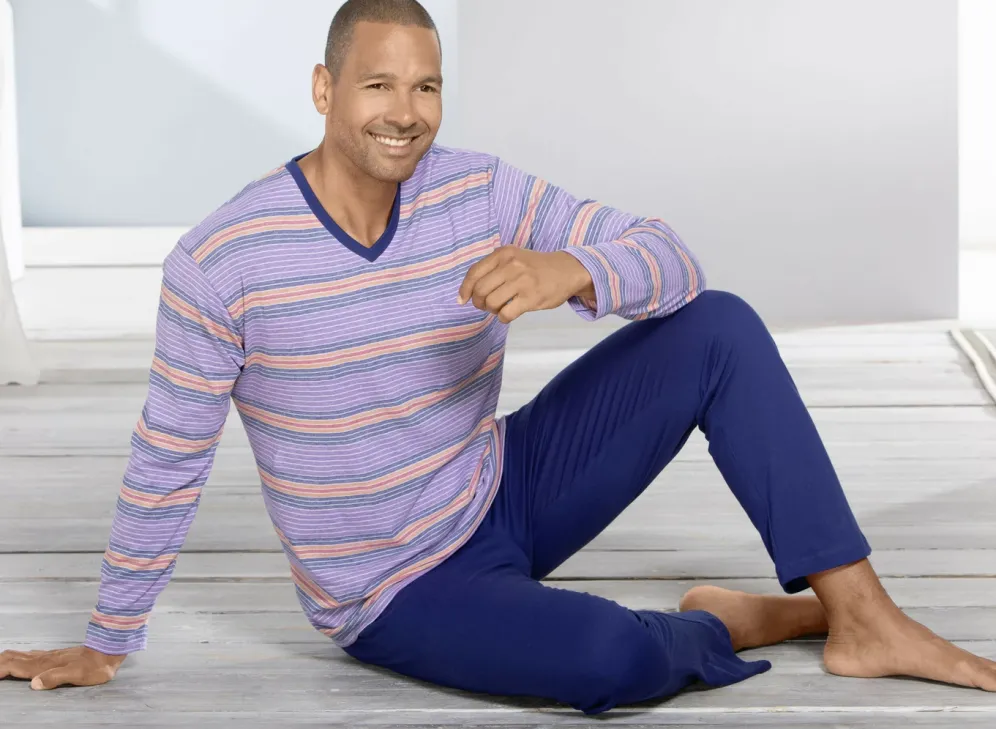 Farbharmonischer Schlafanzug! Oberteil mit garngefärbtem Ringel in Flieder-Marine-Bunt, V-Ausschnitt,