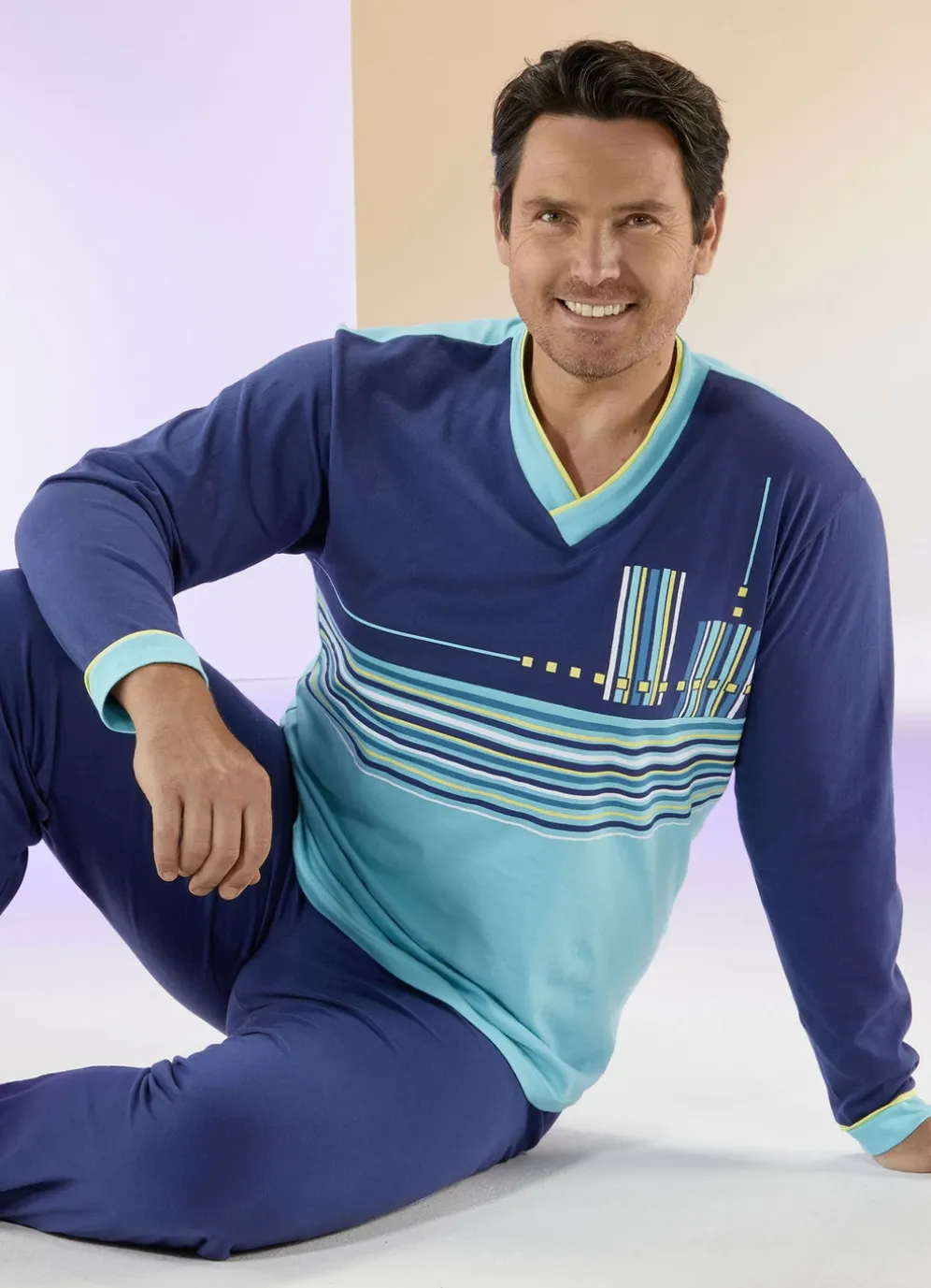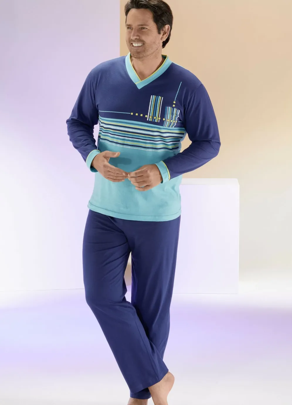 Peppiger Schlafanzug in Blau-Türkis-Bunt! Das Oberteil mit Ringeldessin und Druckmotiv vorne sowie Kontrastpaspeln am V-Ausschnitt und an den Ärmelabschlüssen. Die lange Hose mit auswechselbarem Gummizug im Bund und offenen Beinabschlüssen.