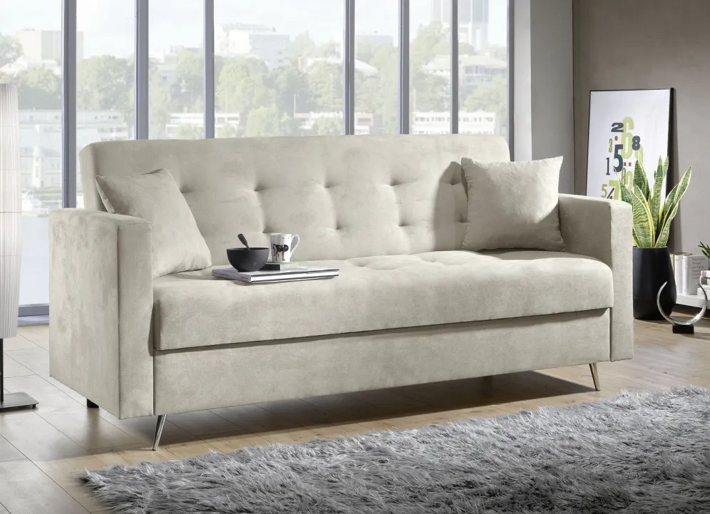 Schlafsofa auf Chromfüßen mit Bettkasten in Creme.