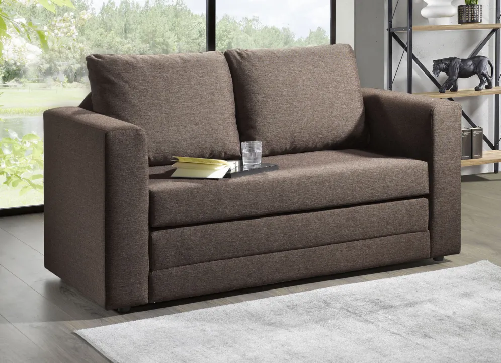 Nicht nur zum Relaxen perfekt geeignet – dieses gemütliche Schlafsofa ist auch im Handumdrehen in ein komfortables Bett für Übernachtungsgäste verwandelt. Auf stabilem Holzgrundgestell gefertigt, Rückenlehne mit Polstervlies-, Sitzfläche mit bequemer Schaumstoff-Polsterung. Stoffbezug aus 100% Polyester. Mit 2 großen, weichen Rückenkissen, befüllt mit Schaumstoff-Polyurethan. Auf 3 cm hohen Kunststofffüßen. Rückseite mit Spannstoff bezogen. Die Lieferung erfolgt aufgebaut