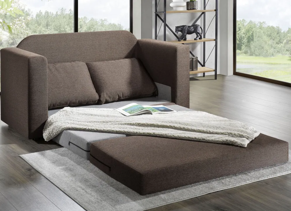 Schlafsofa mit 2 großen, weichen Rückenkissen in Beige.