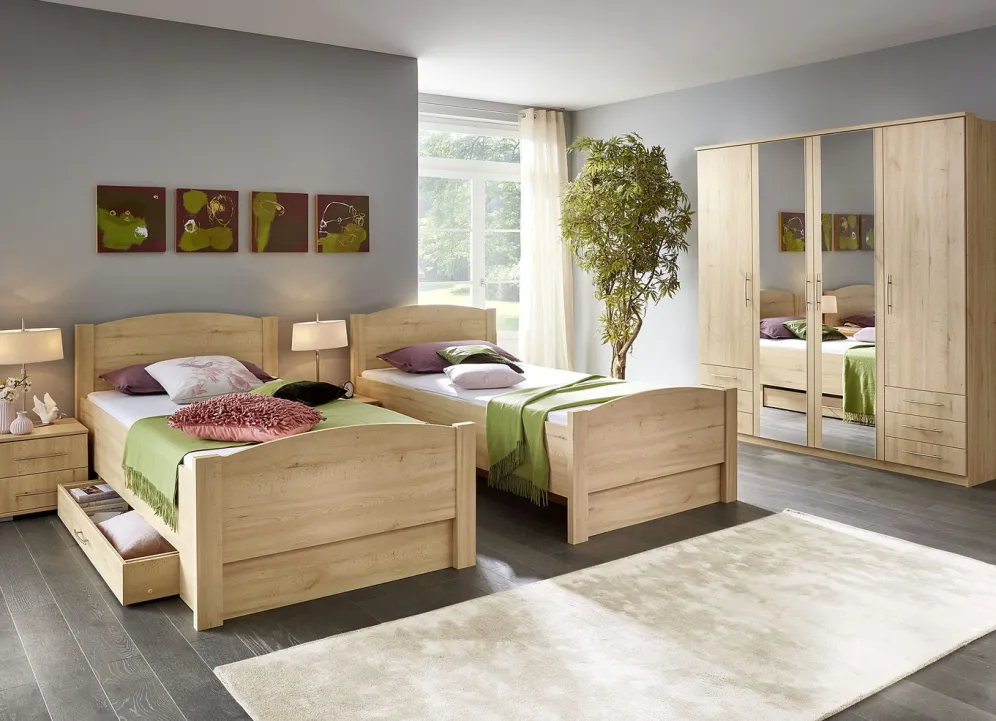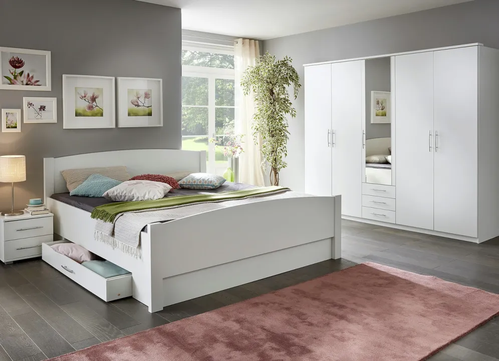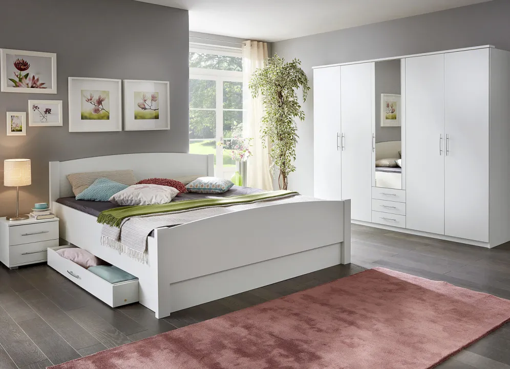 Komfortables, vorteilhaftes Wohnen: Schlafzimmerprogramm in Buche livorno, Weiß oder Eiche sonoma. Schubladen mit Metallführungsschienen. Mit Aufbau-Anleitung