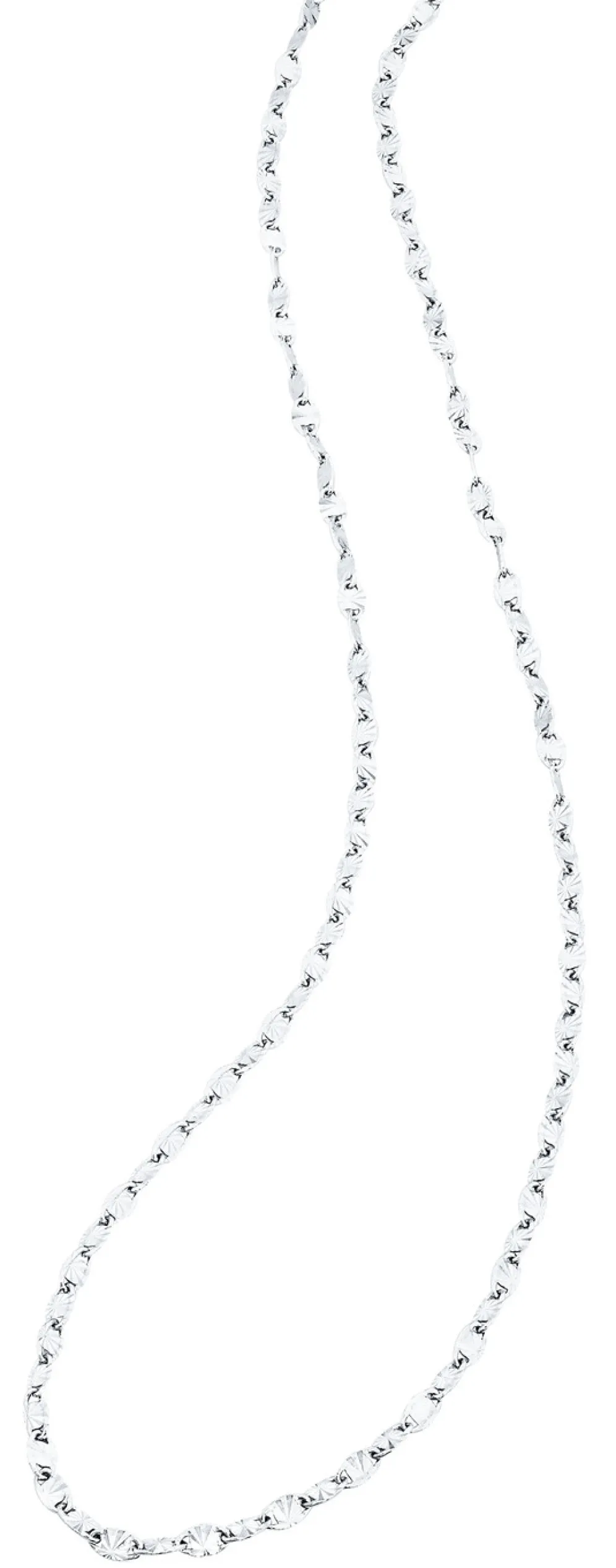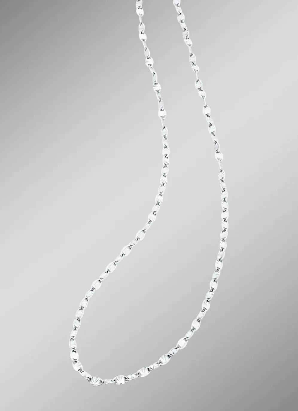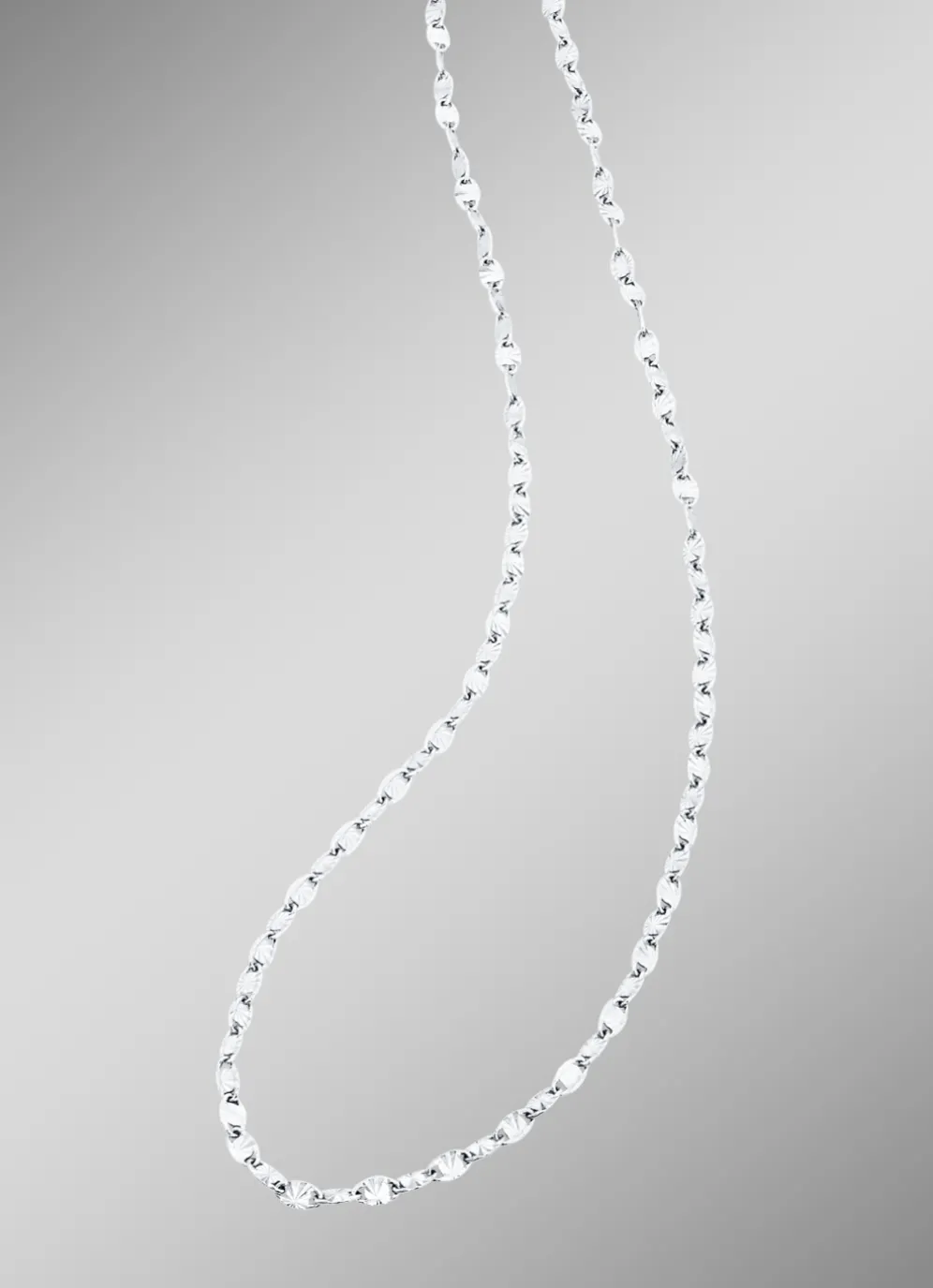 Schlicht und elegant zugleich ist diese wunderschöne Halskette aus Weißgold 585/- fein oder Weißgold 375/- fein. Mit einer Länge 45 cm und einer Breite von ca. 2 mm legt sich dieses Schmuckstück angenehm um Ihren Hals.