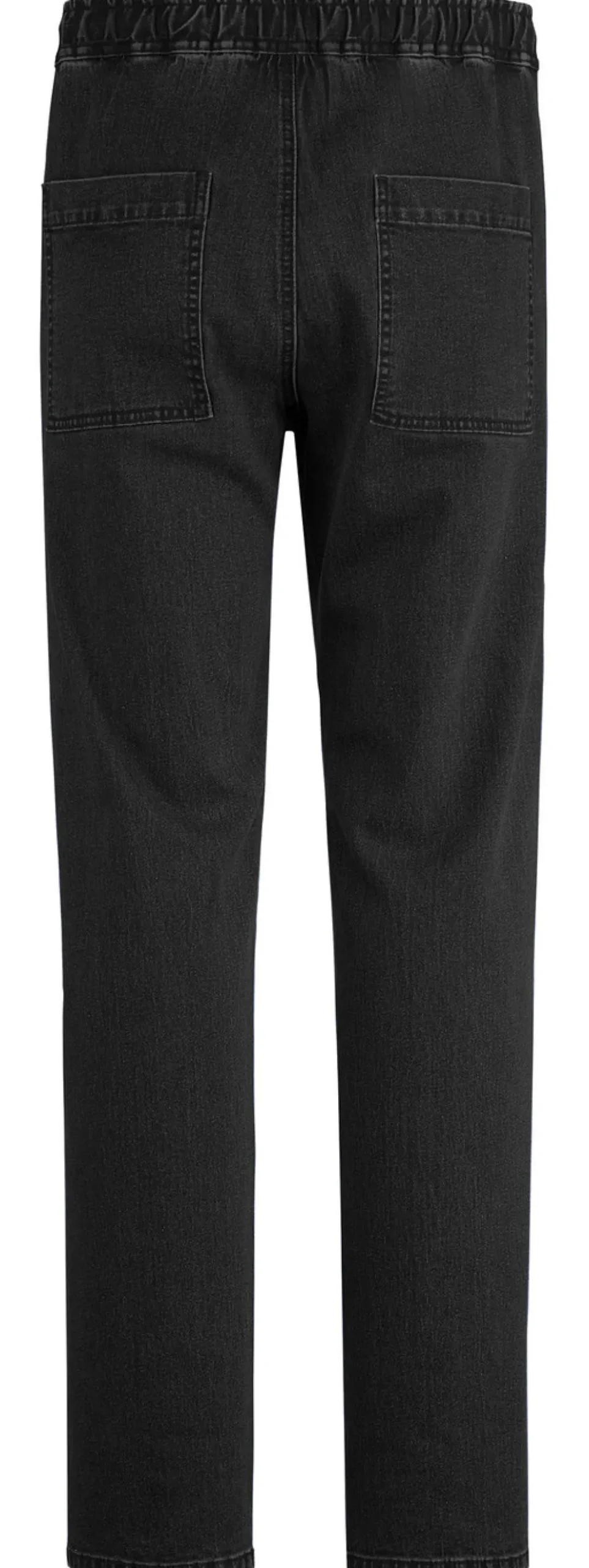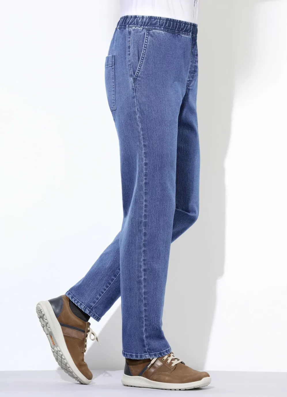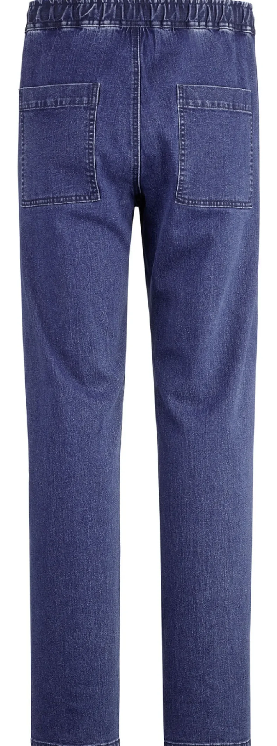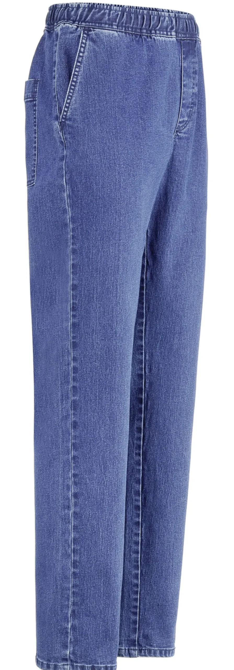 Komfortable, hochelastische Schlupfjeans mit Gummibund rundum, Seitentaschen sowie aufgesetzten Gesäßtaschen.