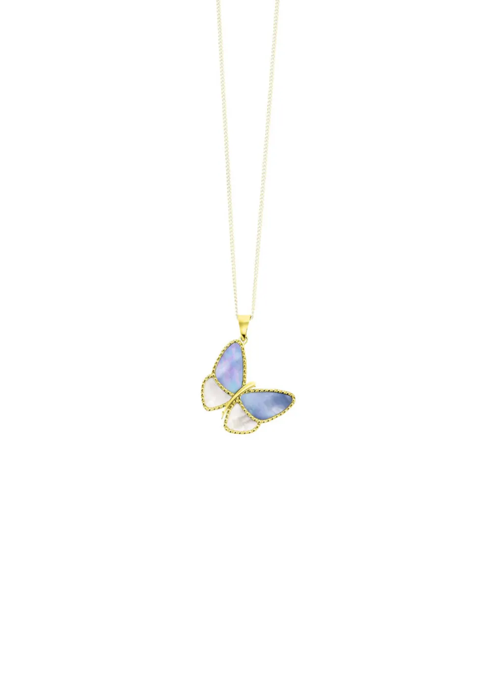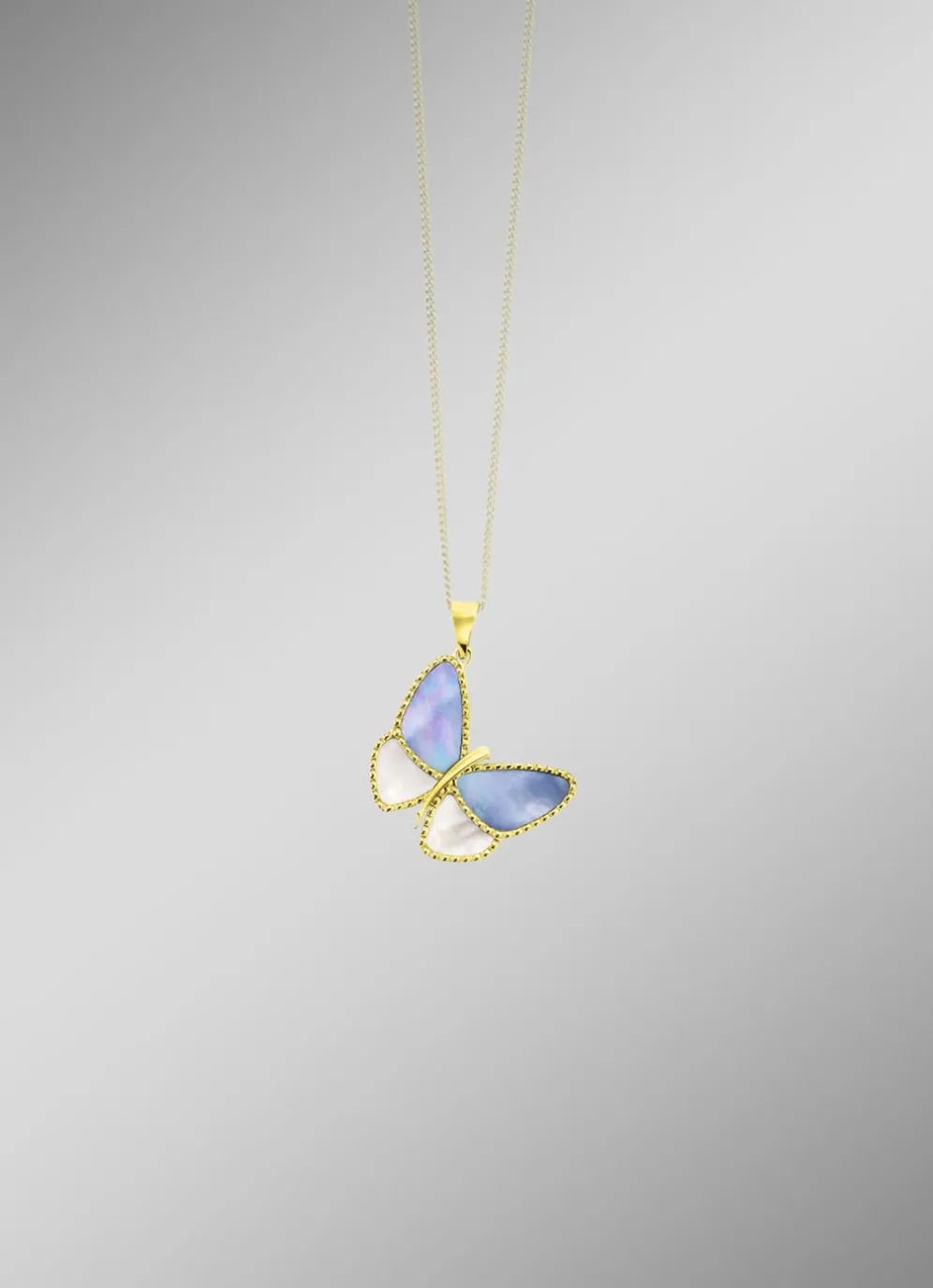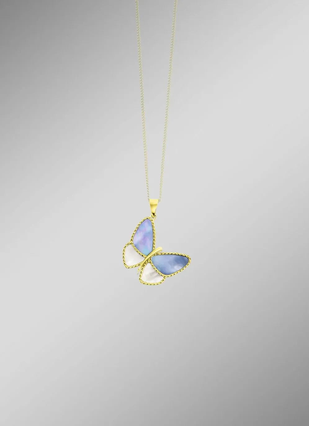 Dieses filigrane Schmuckstück aus 585/- feinem Gold besticht durch seine zarte Form und die wunderschöne Perlmutt-Einlage in Weiß und Blau. Der Schmetterling misst 18×20 mm und ist ein echter Blickfang. Die verdeckte Öse ermöglicht eine elegante Befestigung an Ihrer Lieblingskette.