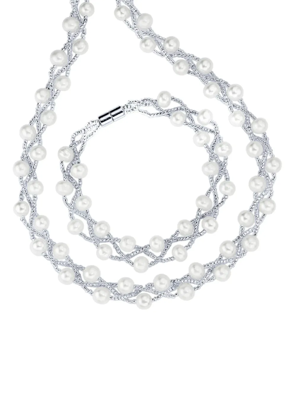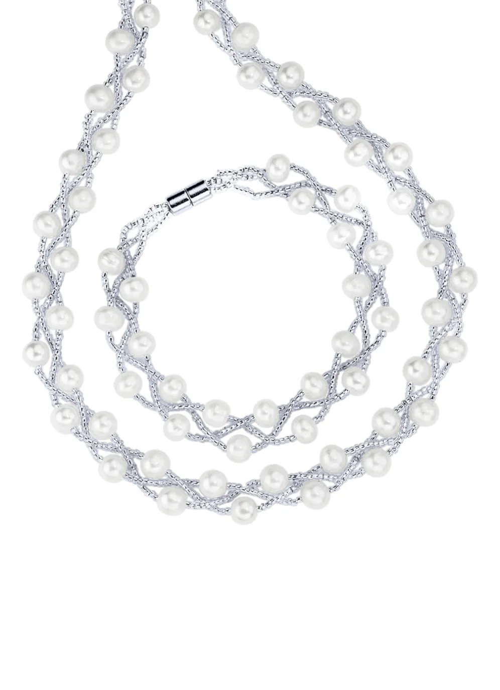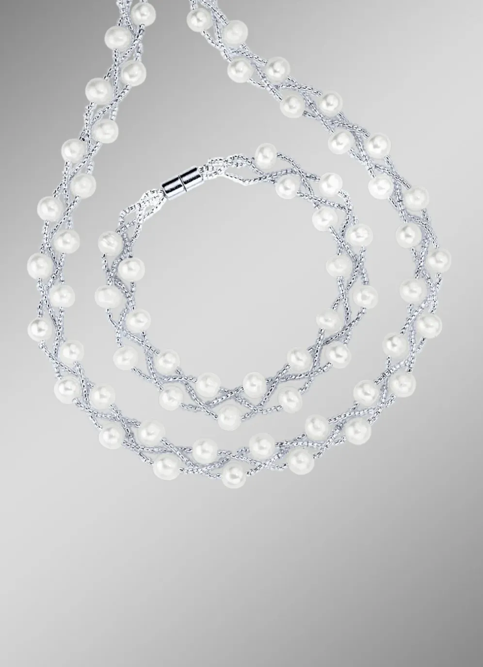Wunderschönes 2-teiliges Schmuckset aus Silber 925/- fein. Das Set enthält eine 3-reihige Halskette und ein passendes Armband. Die Halskette ist 45 cm lang und das Armband 19 cm . Beide Stücke sind mit Süßwasser-Zuchtperlen und Kristallstäbchen verziert. Das Set wird mit einem Magnetverschluss gesichert.