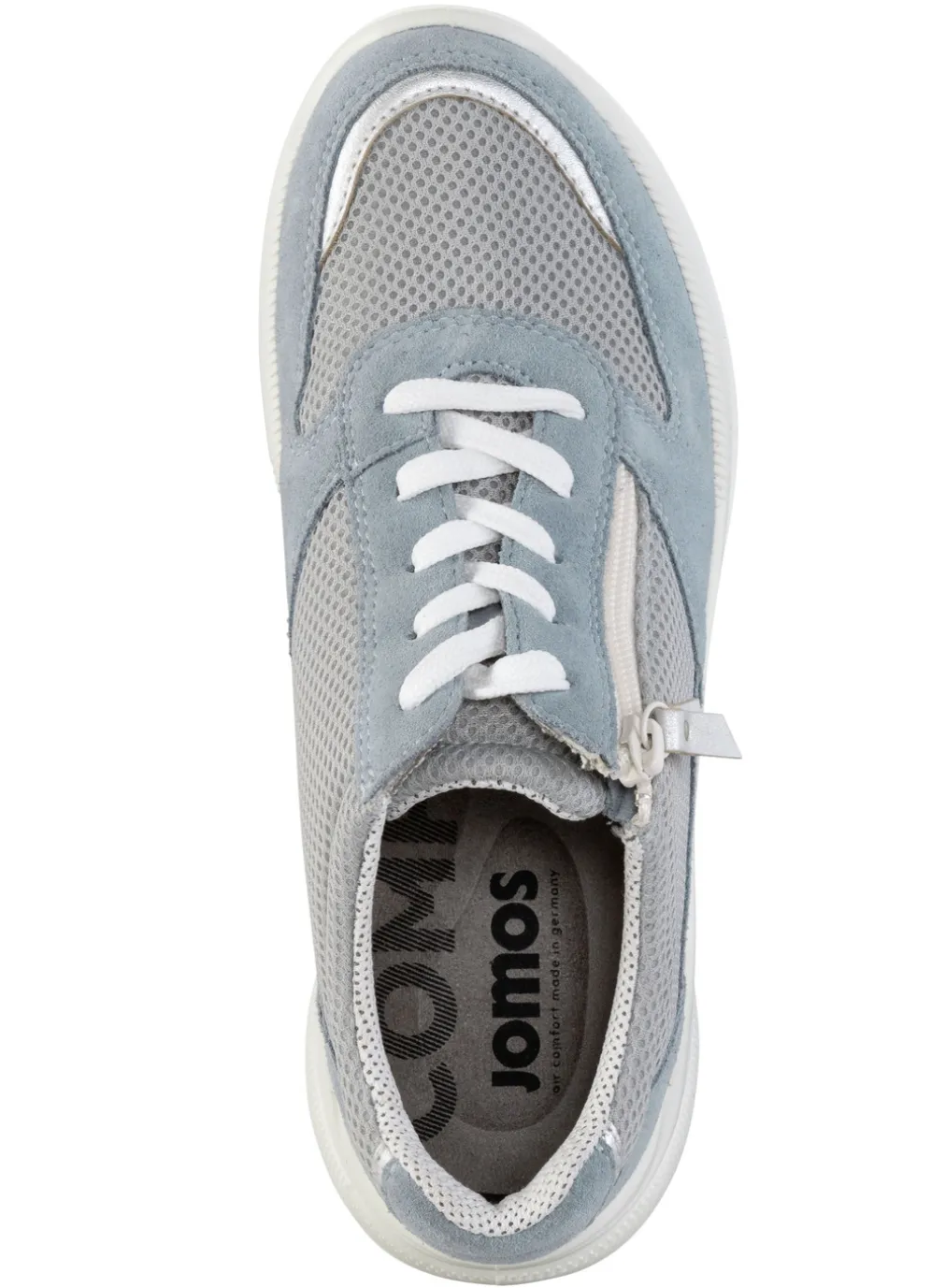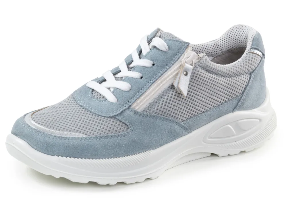 Schnürschuh aus luftigem Meshmaterial und Veloursleder, mit silberfarbenen Besätzen: Weite K, seitlicher Reißverschluss, gepolstertes Textilfutter, herausnehmbares Fußbett, leichte PUR-Profilsohle mit bester Abrollfunktion und breiter Auftrittsfläche, daher Gelenk unterstützend sowie 15 mm Keilabsatz