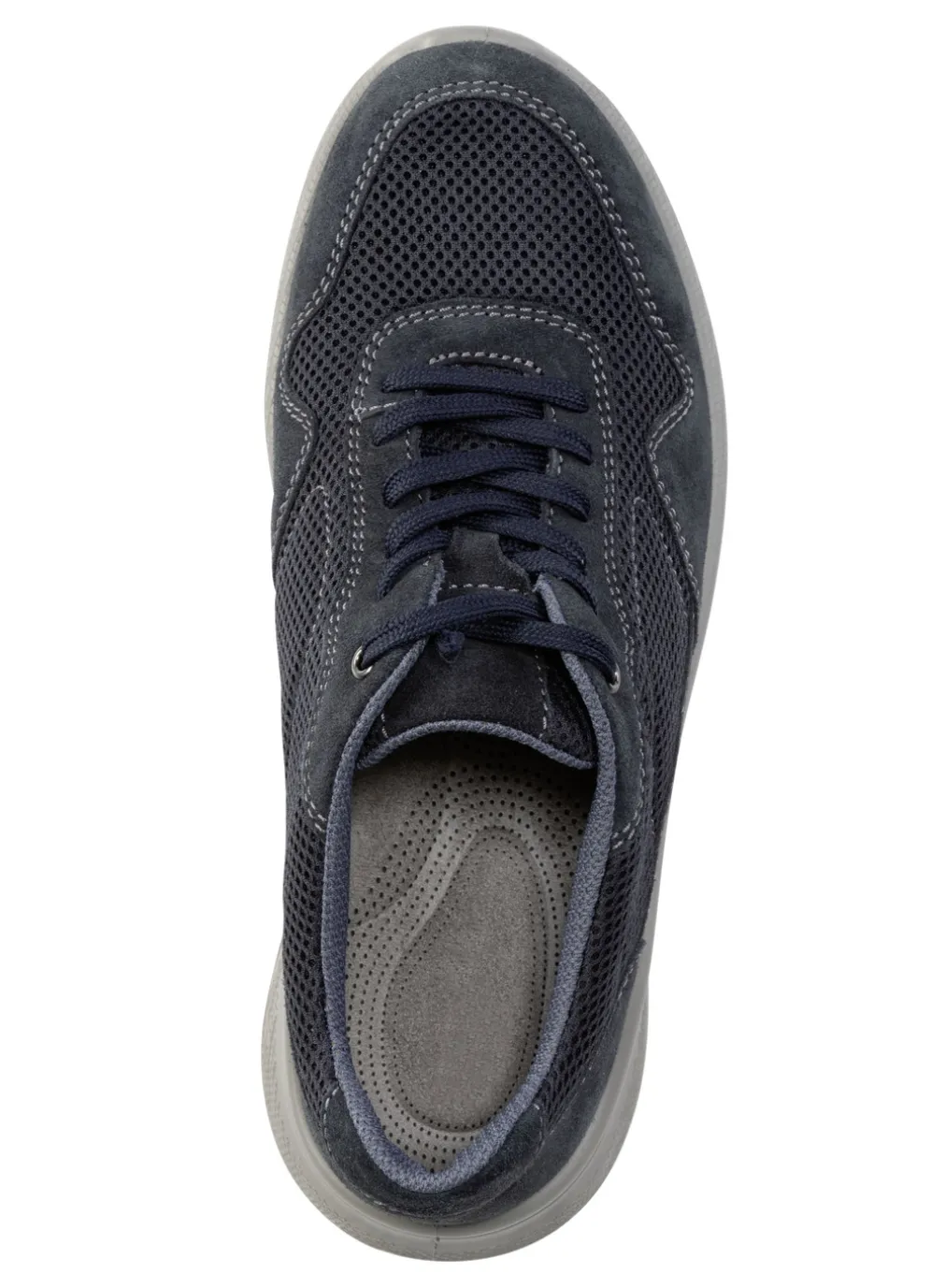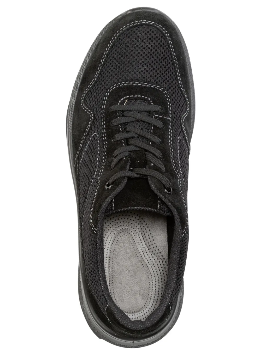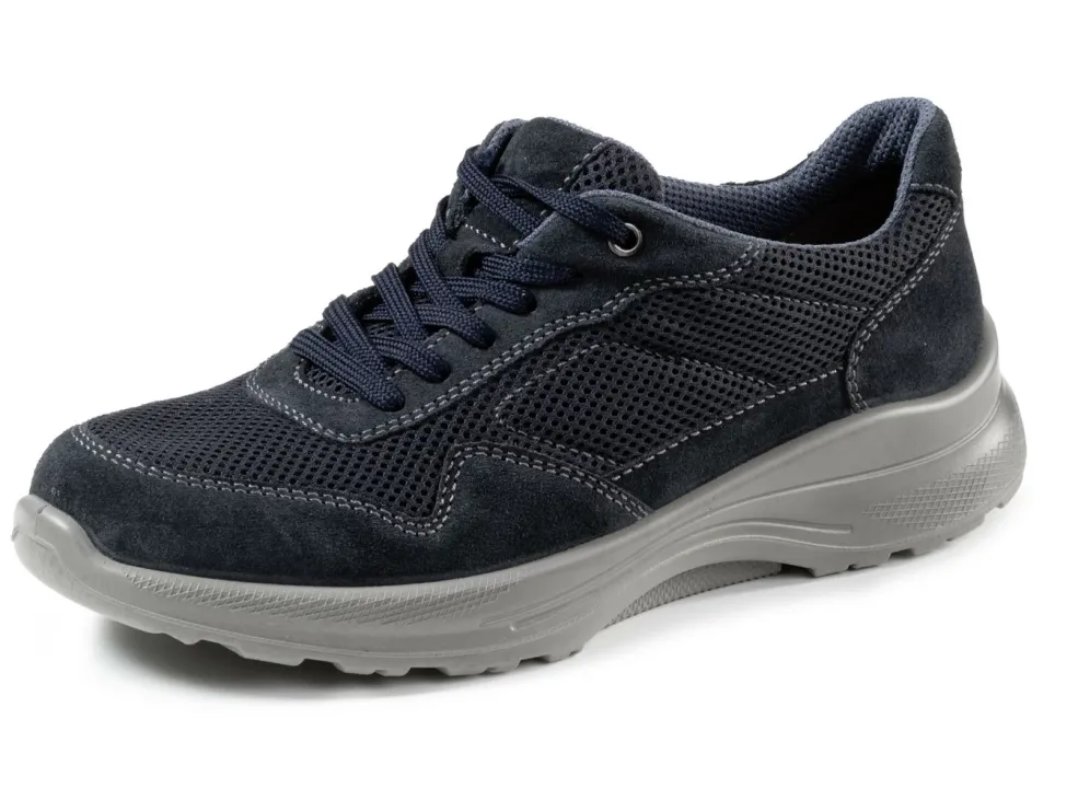 Schnürschuh aus Veloursleder und luftigem Textilmaterial: Weite H, gepolstertes Textilfutter, herausnehmbares, atmungsaktives Fußbett sowie leichte PUR-Luftpolster-Profilsohle mit Abrollfunktion und breiter Auftrittsfläche, daher Gelenk schonend