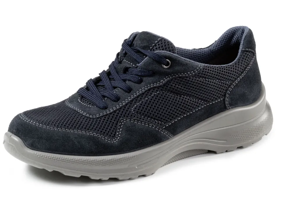 Schnürschuh aus Veloursleder und Textilmaterial in Dunkelblau und in Größe 42.