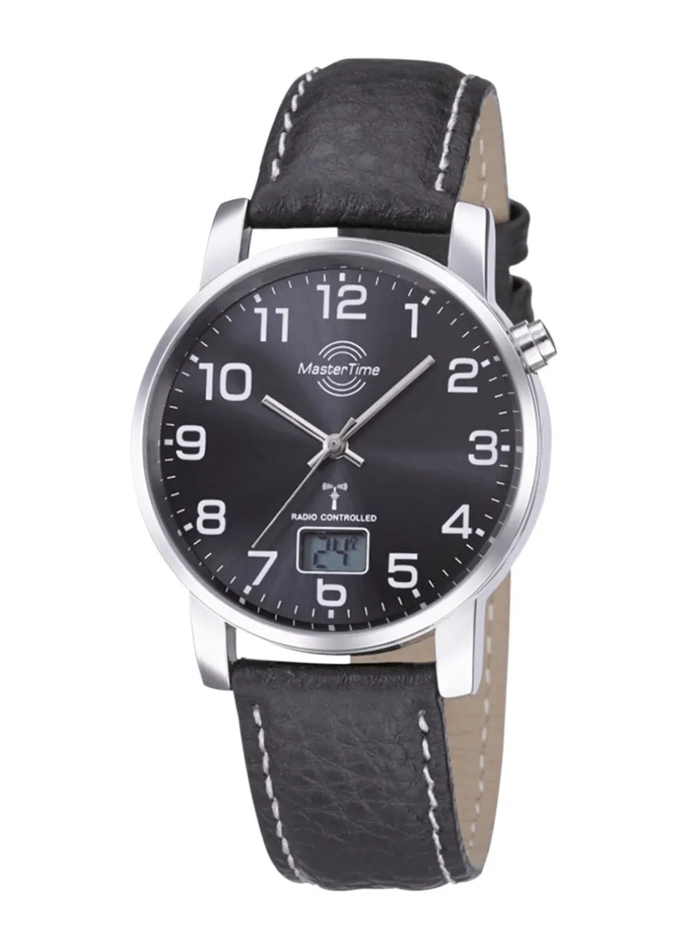 Master Time. Schöne Herren-Lederarmbanduhr mit Metallgehäuse und Edelstahlboden. Funkgesteuert, mit Sekunden- Datums- und Tagesanzeige im Digitalfeld. Automatische Umstellung von Sommer- und Winterzeit. Die Uhr ist bis zu 3 Bar wasserdicht und hat einen Gehäusedurchmesser von 42 mm.
