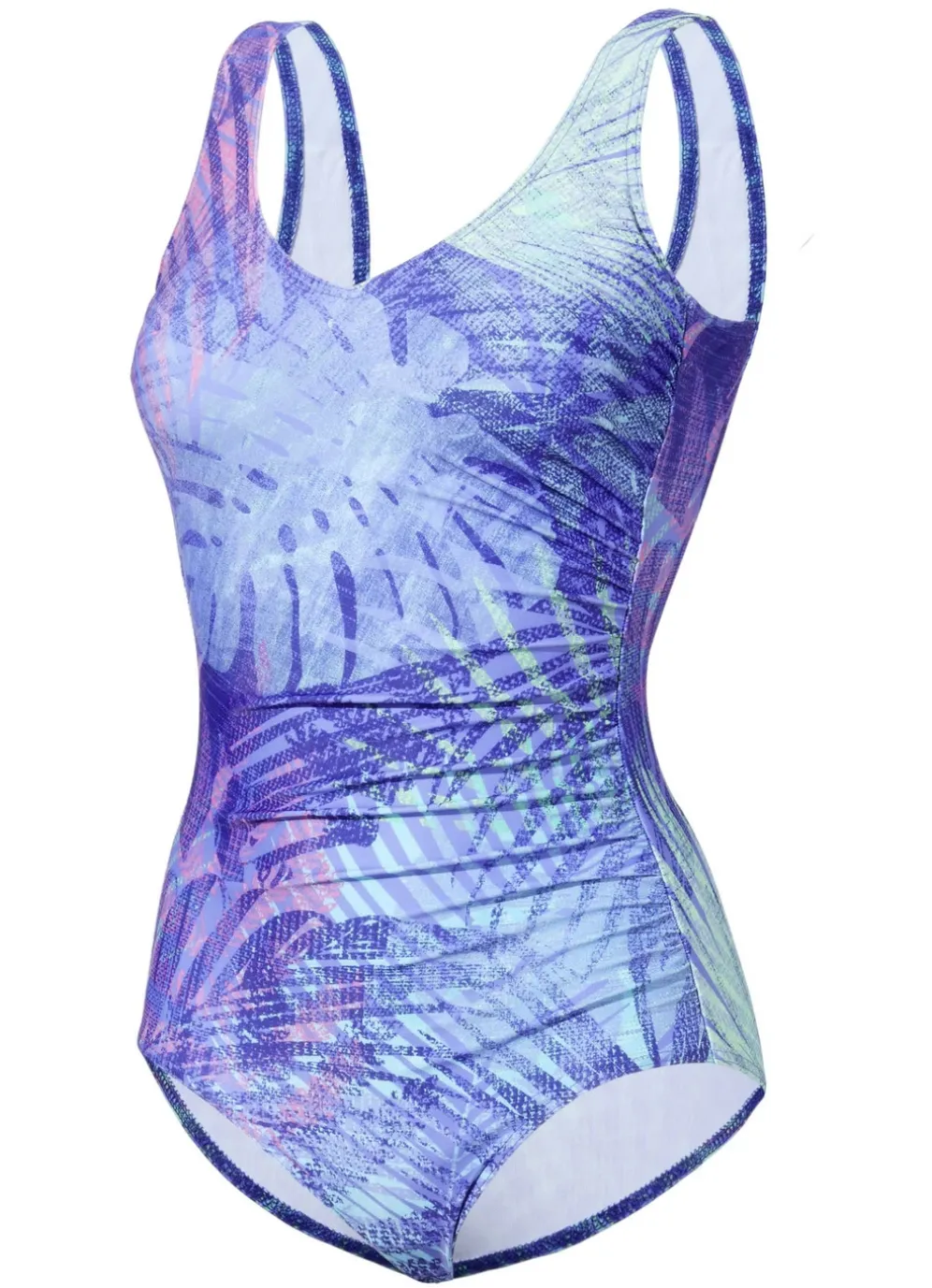 Fliederfarbener Badeanzug von „Schwab“ mit farbharmonischem Alloverdessin im Vorder- und Rückteil, seitlicher Raffung, Vollkorsage, Softschalen sowie Unterbrustband.