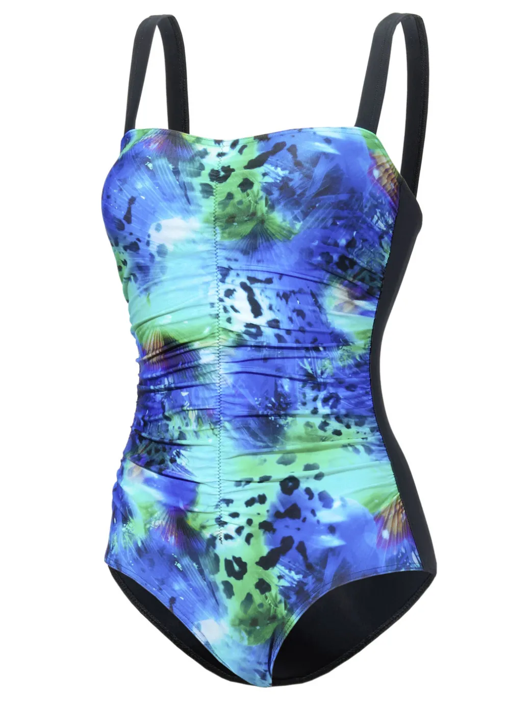 Schwab Badeanzug mit Halbkorsage und Raffungen in Cup C, in Schwarz-Bunt sowie in Größe 40.