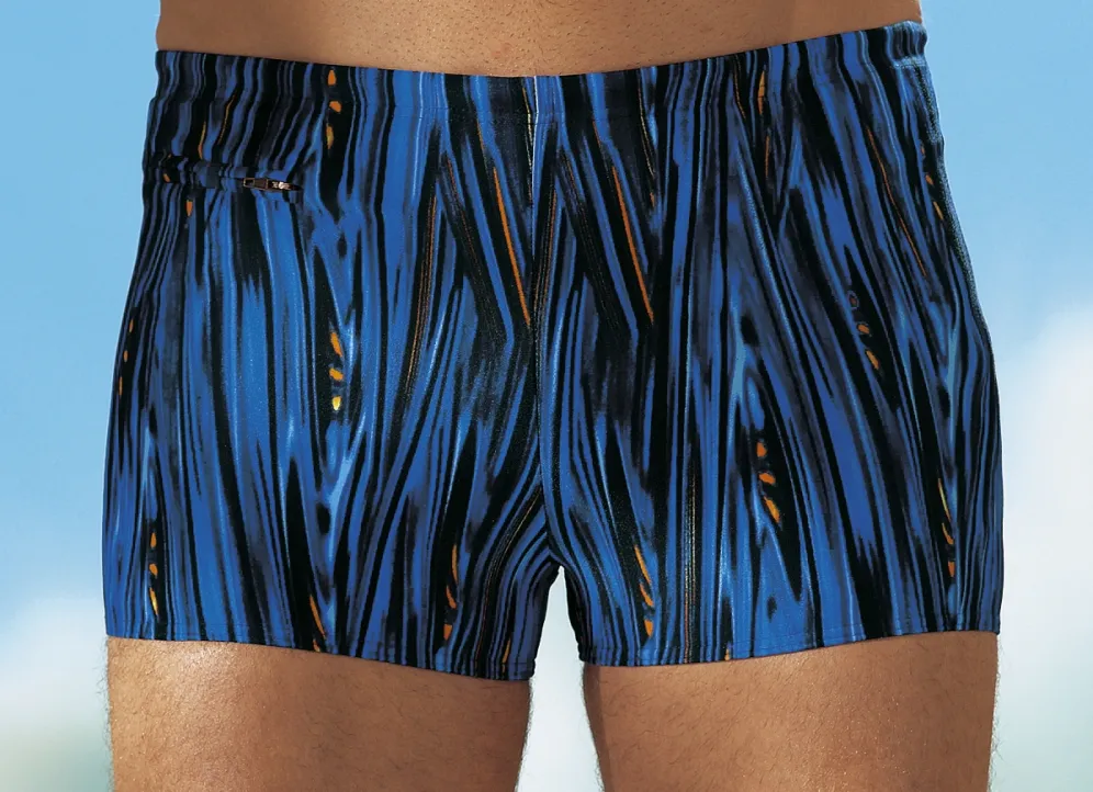 Fantasievoll gestaltete, royalblau-schwarz-bunt dessinierte „Schwab“-Badehose in höherer Kastenform:
