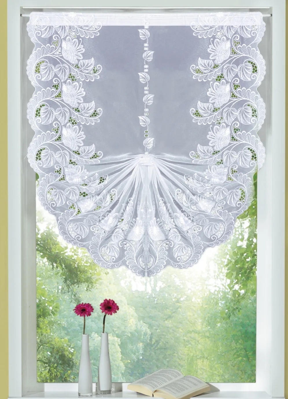 Schwalbenschwanz-Gardine mit echter Plauener Stickerei in Größe 117 (H 80xB 60 cm) und in Weiss.