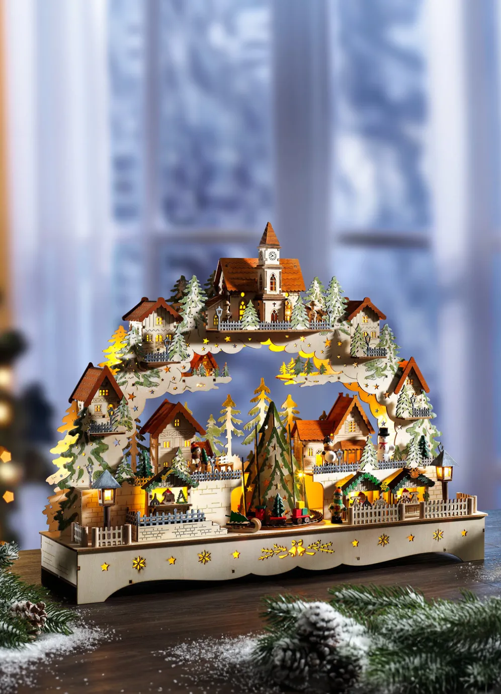 Dieser imposante Schwibbbogen sorgt für weihnachtliche Atmosphäre in Ihrem Zuhause. Er zeigt ein kleines Winterdorf in dem ein Weihnachtsmarkt stattfindet. Oben auf der Spitze steht eine Kirche. In der Mitte stehen Tannen die sich drehen. Die integrierten 20 LEDs bringen das Gesamtbild zum Strahlen. Aus Holz gefertigt und bemalt. Trafobetrieben mit 4,5 Volt, 1,5 Watt. Lieferung erfolgt mit Trafo. Zuleitung ca. 3,4 m. Maße: B57xH45xT15,5 cm.
