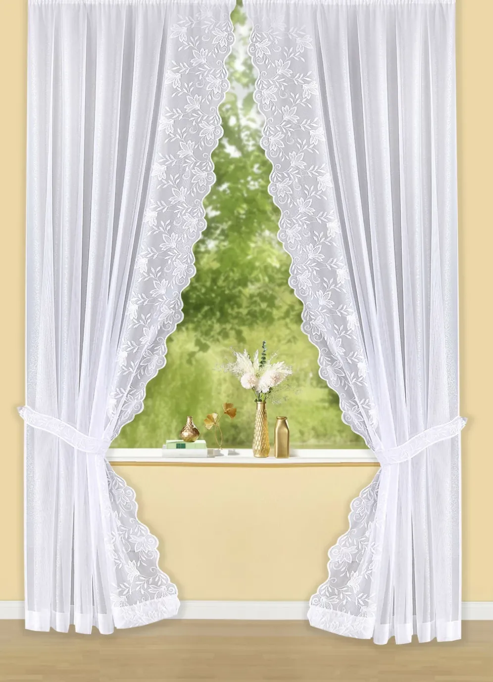 Hochwertige und aparte Seitenschal-Garnitur! Mit wunderschöner Blätter-Stickerei und Universalschienenband versehen. 2 Schals in einer Packung. Maße pro Schal, Preise pro Garnitur. Die Qualität: 100% Polyester