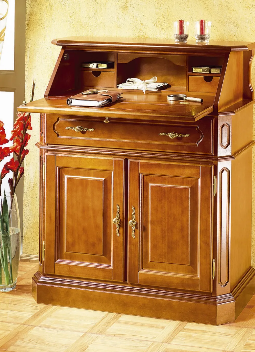 Schöner Sekretär: Hinter der Klappe befindet sich eine große Schreibfläche (B70xT43 cm), dahinter 3 Fächer und 2 kleine Schubladen, darunter 1 große Schublade. Unten 2 Türen, dahinter 1 Einlegeboden.