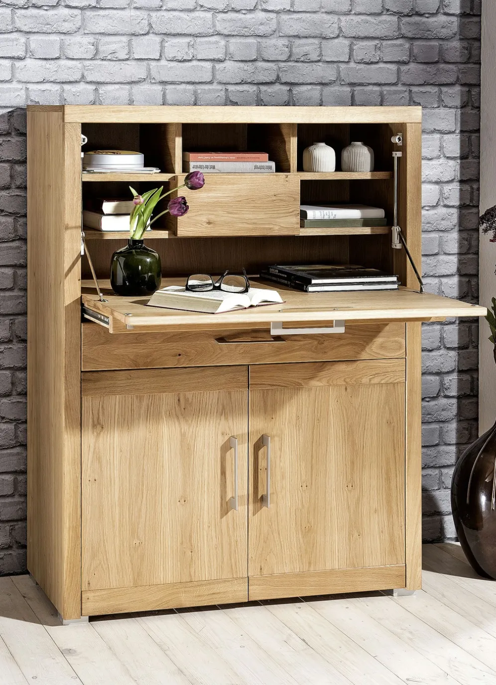 Ansprechende Möbelserie mit massiver Front und furniertem Korpus. In Wildeiche ist die Oberfläche geölt, in Kernbuche mit Wachseffektlack. Schubladen mit Softclose-Beschlägen. Die Lieferung erfolgt aufgebaut