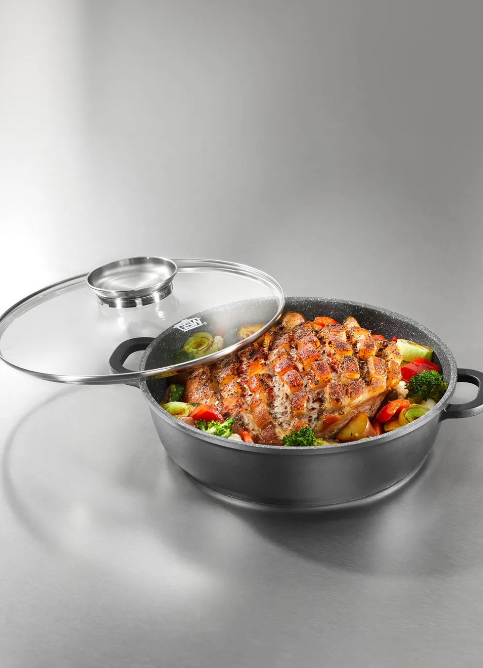 „GSW“ Servierpfanne aus hochwertigem Aluguss mit langlebiger „VITAFLON®GRANIT“ Antihaftbeschichtung. Für die fettarme Zubereitung von Speisen. Optimale Hitzeverteilung und Energiesparend dank extra starkem FerroTherm® Boden. Glasdeckel mit Aromaknopf und Dampfablassventil. Backofengeeignet mit Deckel bis 240 °C . Für alle Herdarten geeignet, auch Induktion. Spülmaschinengeeignet.