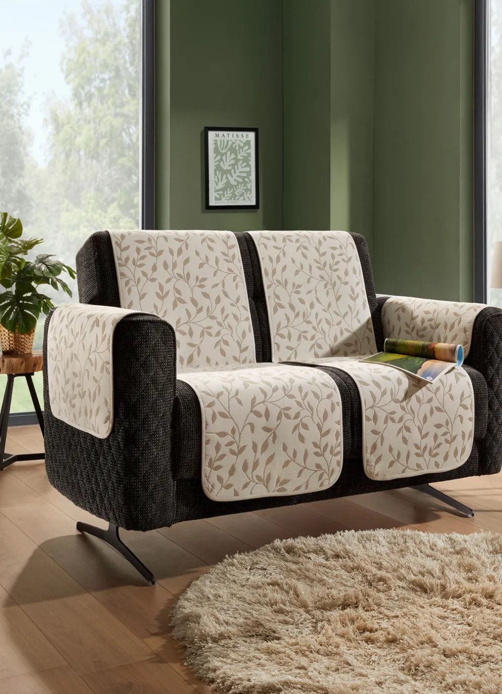 Natürlich schöne Wohnaccessoires mit tollem Blättermotiv sowie Bandeinfassung. Dank der Anti-Rutsch-Schaumrückseite bleiben die Schoner immer an ihrem Platz. Die Qualität: Jacquard aus 50% Baumwolle und 50% Polyester. Waschbar bis 30 °C.