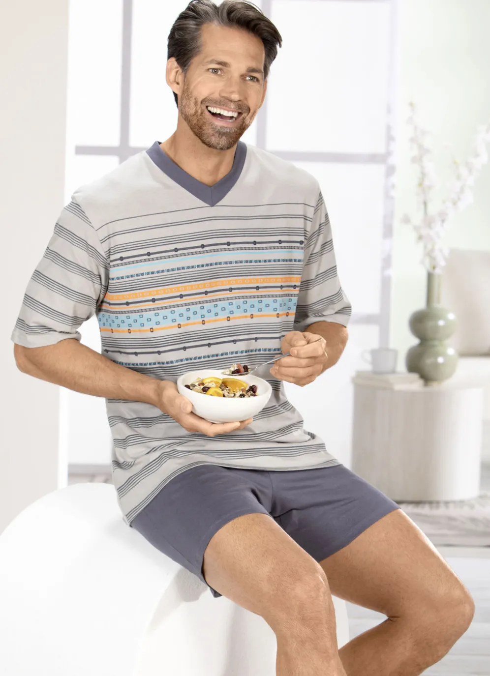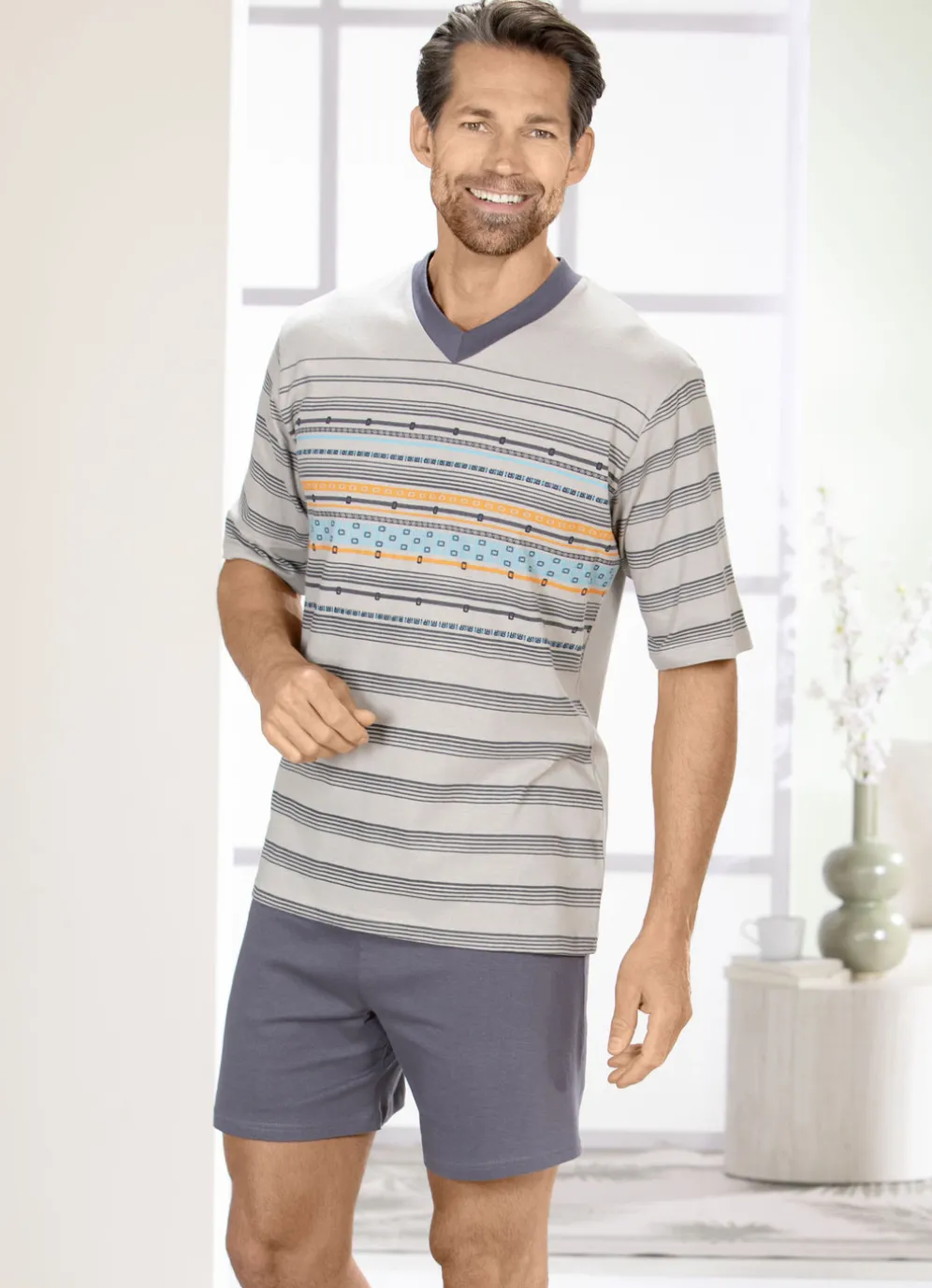 Set: Schlafanzug und Shorty mit V-Ausschnitt in Grau-Bunt und in Größe 46.