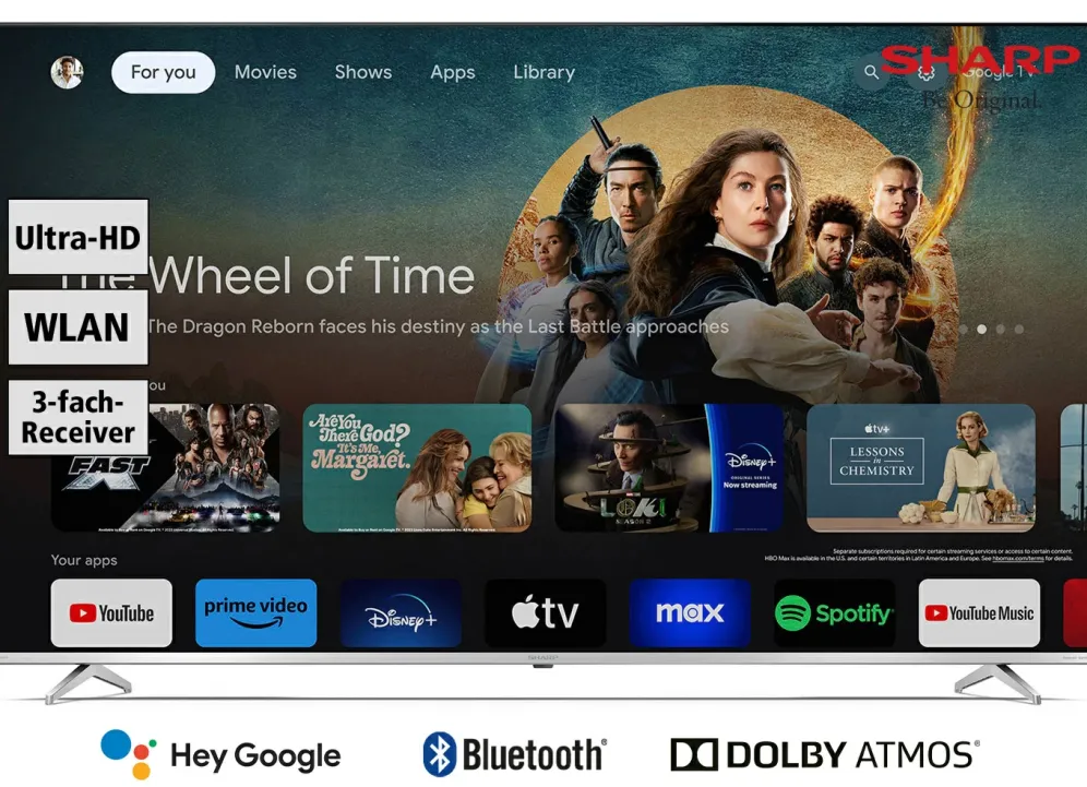 Sharp 70GP6260E. Rahmenloser 4K-Ultra-HD-QLED-Google-TV mit einer herausragenden Bildqualität. Kompatibel mit Google-Assistant, WLAN, Bluetooth, Dolby Vision und Dolby Atmos. Integrierter 3-fach-HD-Receiver. Dolby Digital, Sound Equalizer.