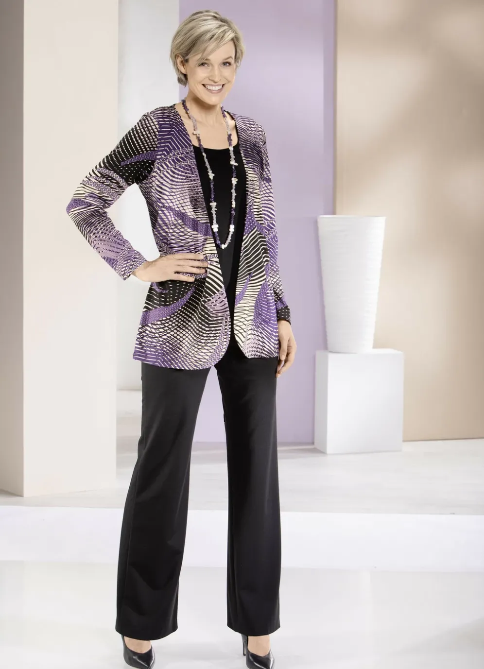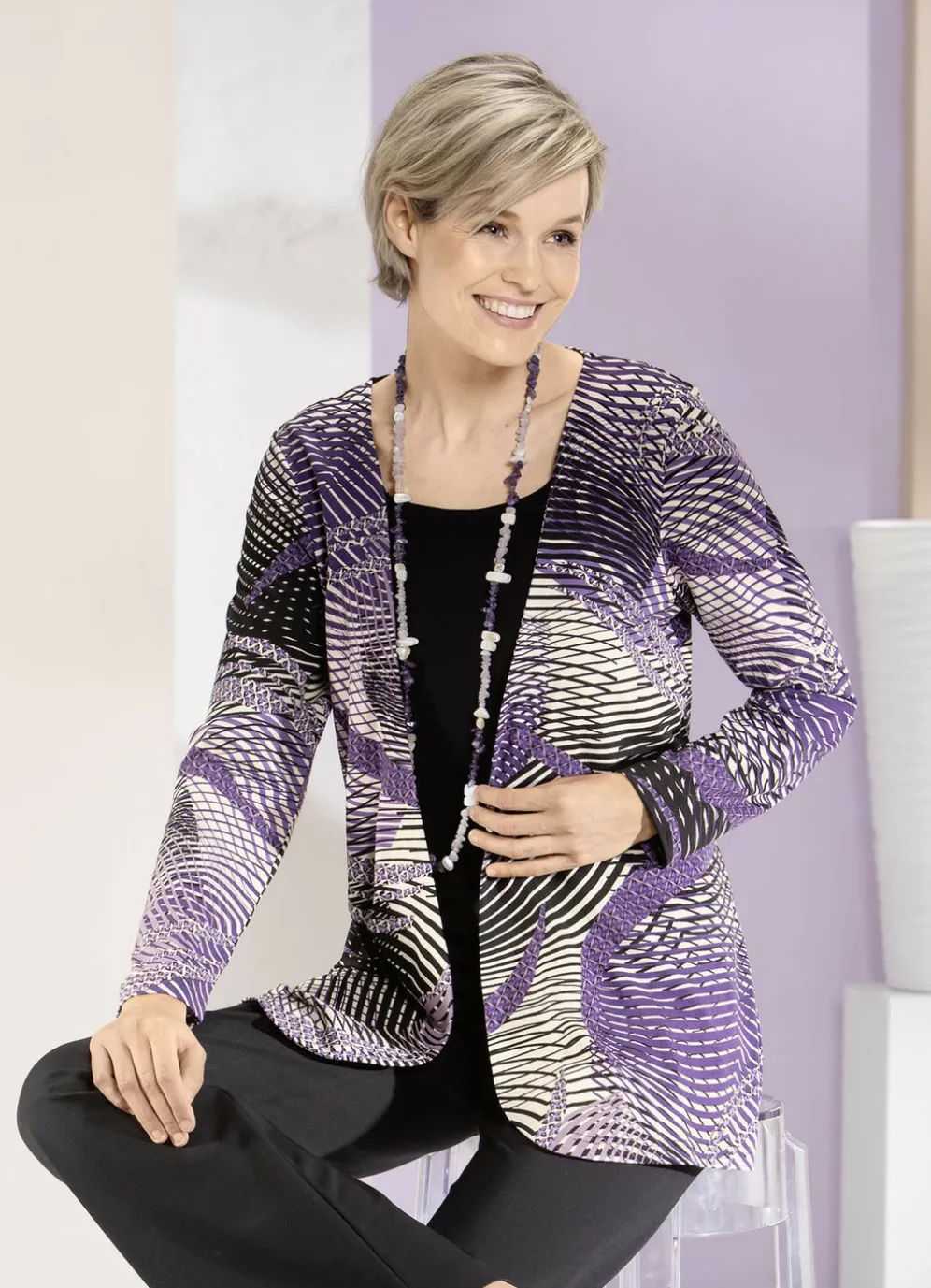 Jedes Teil ein Unikat! Ein absolutes Glanzstück ist dieses bezaubernde Shirt in Jacken-Optik mit Allover-Druck in Ecru-Lila-Schwarz und schwarzem Einsatz im Vorderteil.