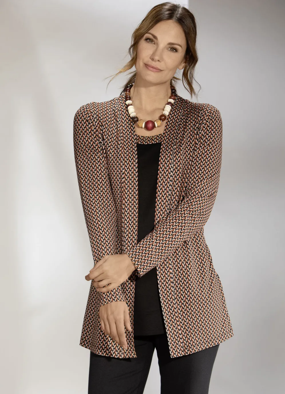 Große Klasse ist dieses faszinierende schwarz-braun-terrakotta-bunte, allover gemusterte Shirt in Jacken-Optik, mit schwarzem Einsatz sowie Strasszier am Halsausschnitt.