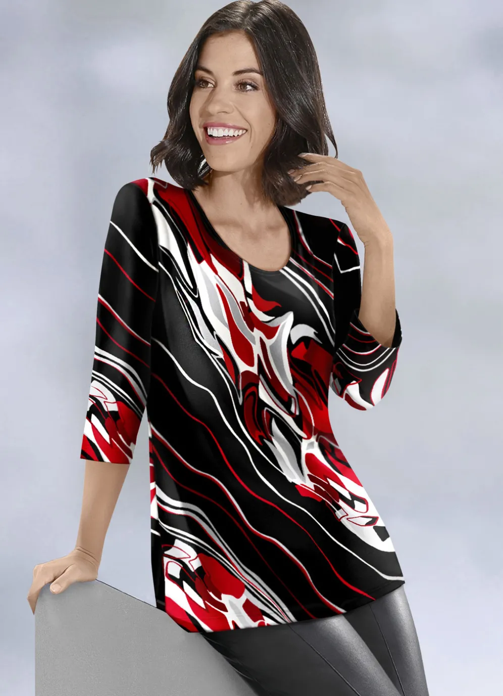 Jedes Teil ein Unikat! Herrliches Shirt mit farbbrillantem Inkjet-Druck in Schwarz-Rot-Weiß allover sowie 3/4-langen Ärmeln.