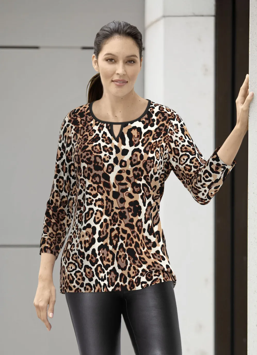Jedes Teil ein Unikat! Fabelhaftes Shirt mit aktuellem Tierfell-Dessin allover in Beige-Schwarz-Ecru, Zierschlitz am Halsausschnitt sowie 3/4-langen Ärmeln.