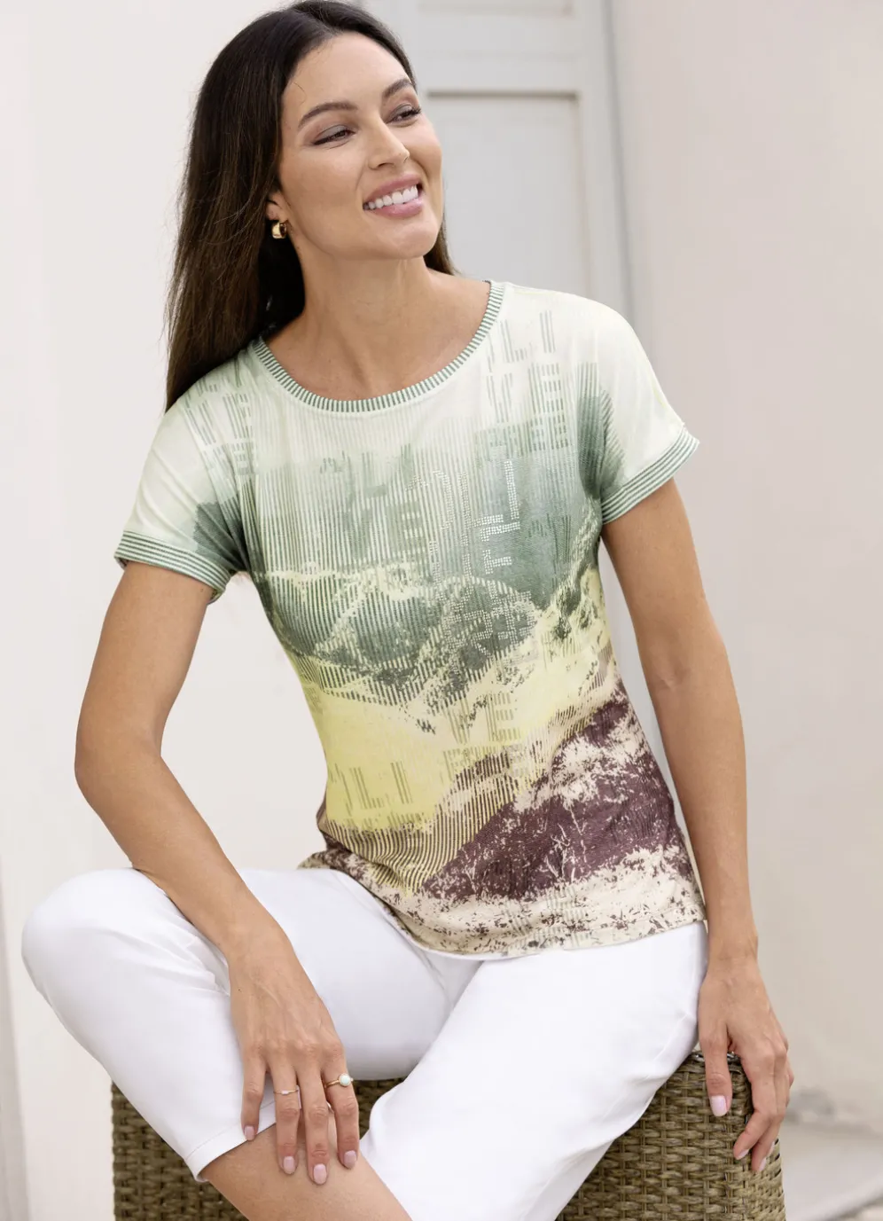 Faszinierendes Shirt mit farbbrillantem Allover-Druck in Gelb-Oliv-Braun, Kontrastabschluss am Halsausschnitt und an der überschnittenen Schulterpartie, Strasszier im Vorderteil, silberfarbene Flatlocknaht und Ziersteppungen an der Schulternaht sowie Seitenschlitze.