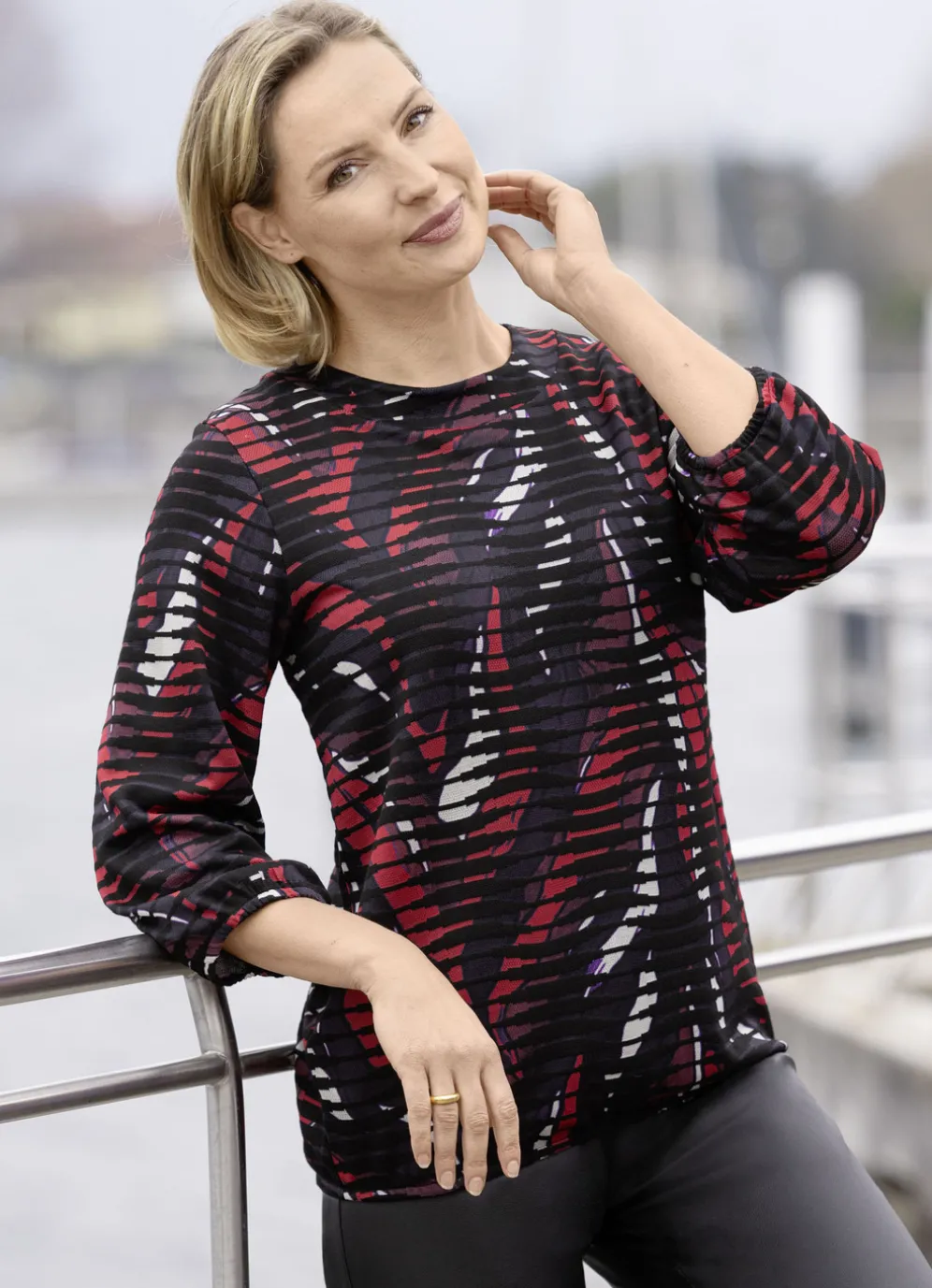 Jedes Teil ein Unikat! Tolles Shirt mit Alloverdruck in Schwarz-Rot-Ecru, Blende am runden Halsausschnitt, Gummizug an den Abschlüssen der Ärmel in modischer Länge und am Saum.