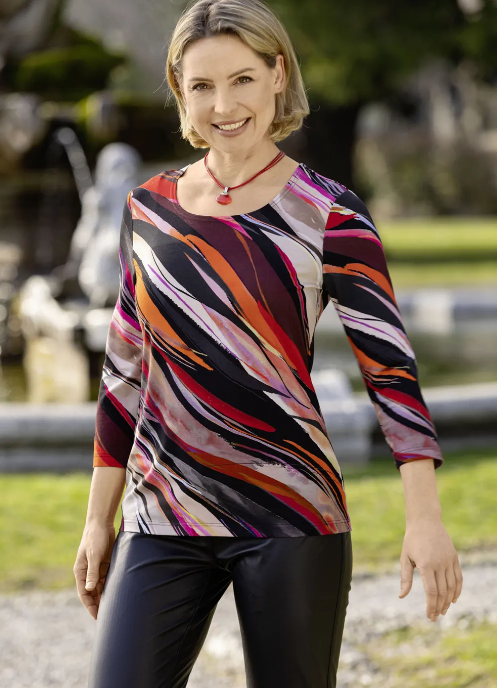 Jedes Teil ein Unikat! Topmodisches Shirt mit farbbrillantem Alloverdruck in Schwarz-Rot-Multicolor, weitem, rundem Halsausschnitt sowie 3/4-langen Ärmeln.