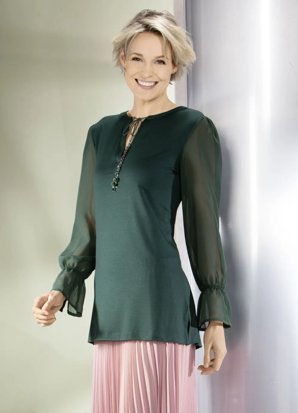 Wunderschönes Shirt mit ausgefallener Ausschnittverarbeitung, Bindeband und abnehmbarer Schmuckkette, Rückenpasse mit Fältelung sowie lange Chiffon-Ärmel mit Gummizug und Schlingenknopfverschluss.
