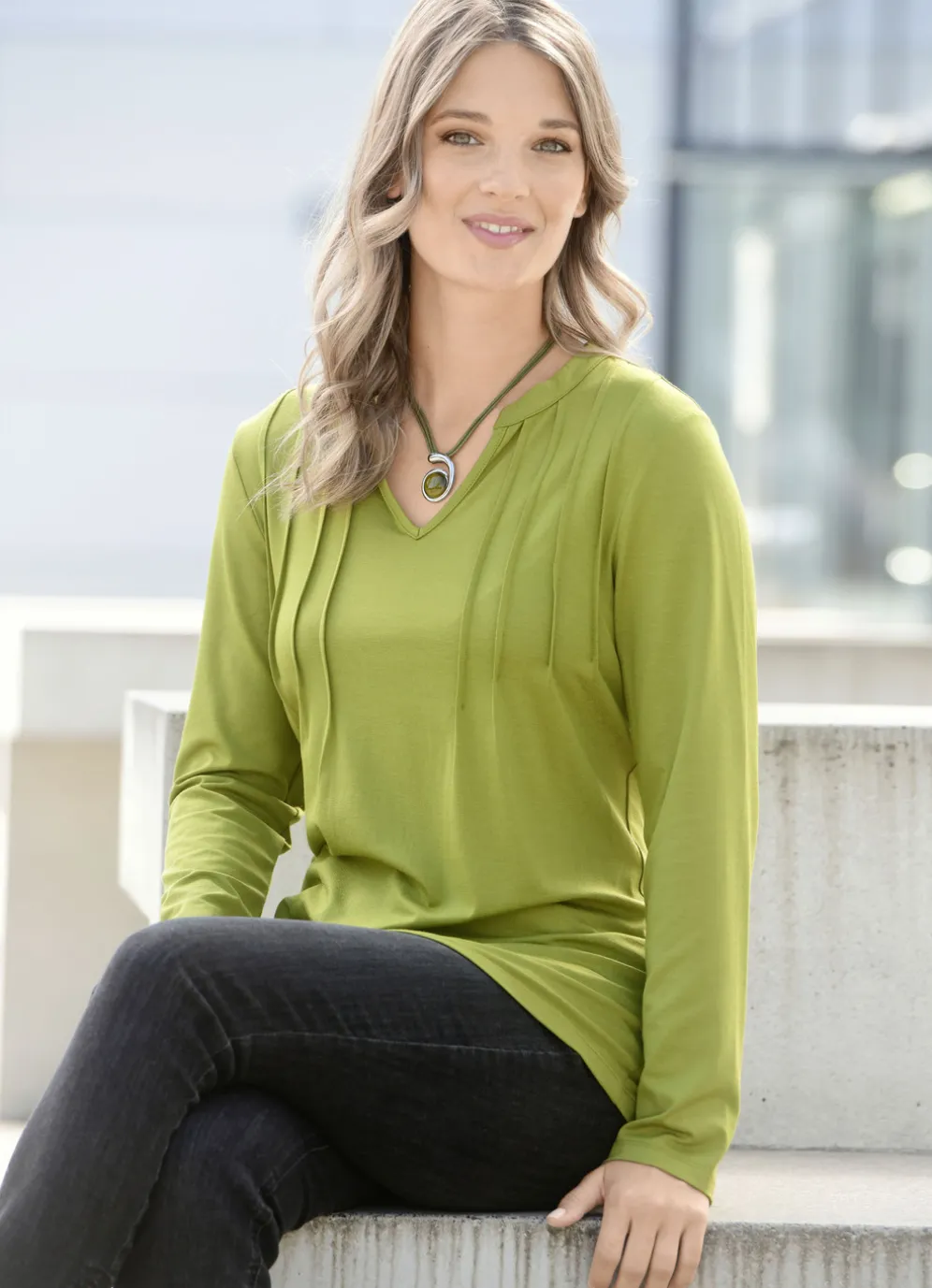 Feminines Shirt in Kiwigrün mit Biesen im Vorderteil.