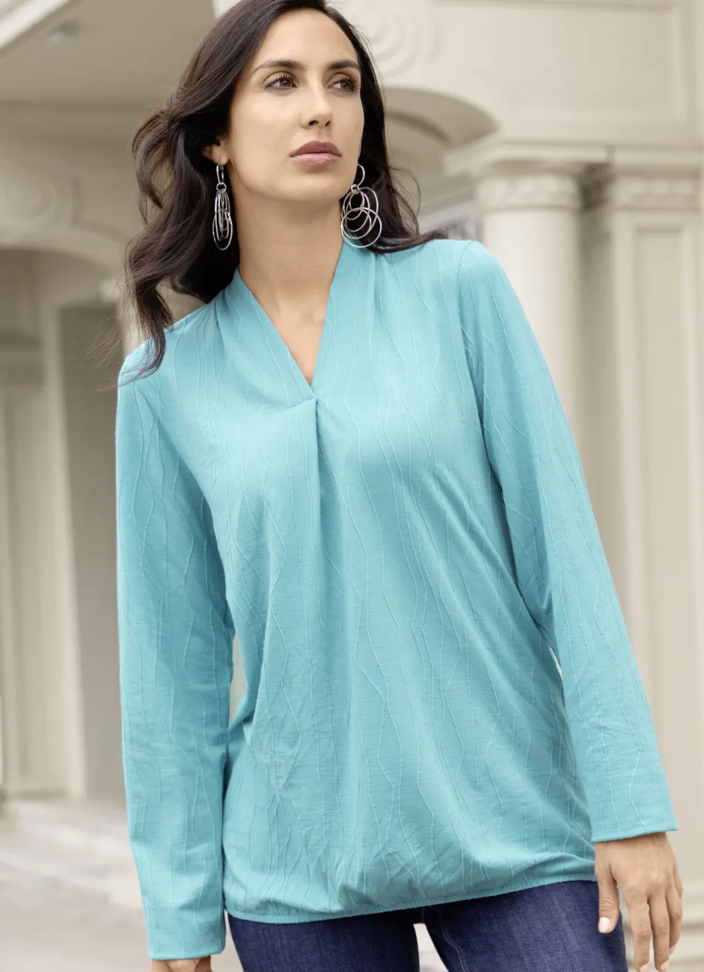 Shirt von laurakent in Türkis, Faltenlegung im Vorder- Rückteil, Schulterpasse hinten sowie Gummizug am Saumabschluss.