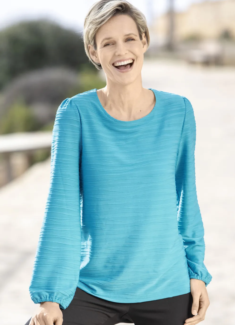 Shirt in Türkis mit dezenter Kräuselung an der Schulterpartie und Gummizugabschluss an den Ärmeln.