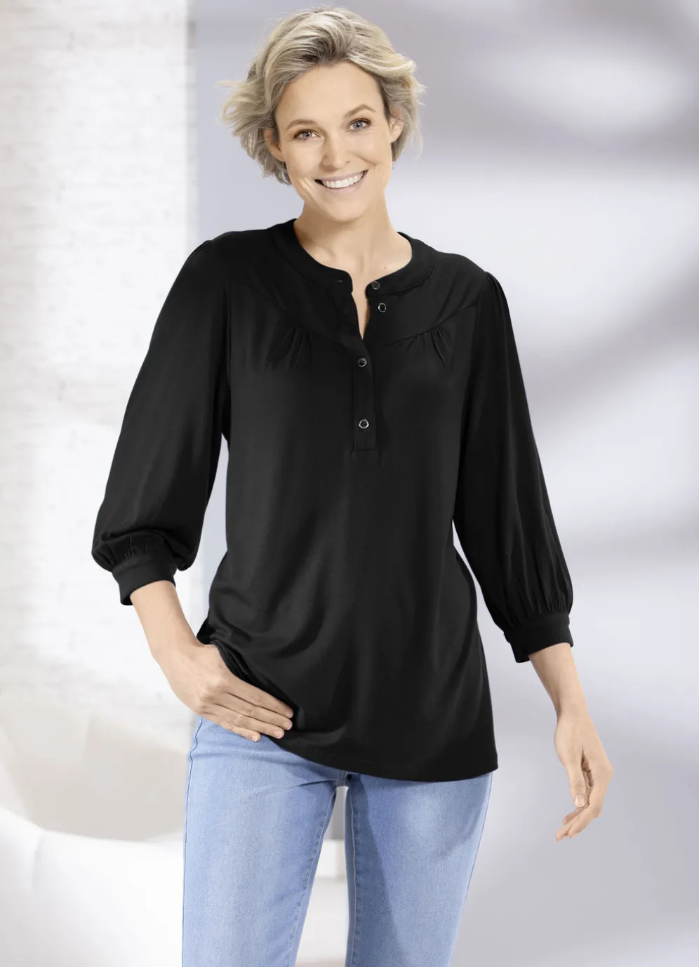 Ein absolutes Highlight ist dieses faszinierende Shirt mit kurzer Knopfleiste, Schulterpasse mit Fältelung im Vorder- und Rückteil sowie 3/4-langen Ärmeln mit Manschettenabschluss.